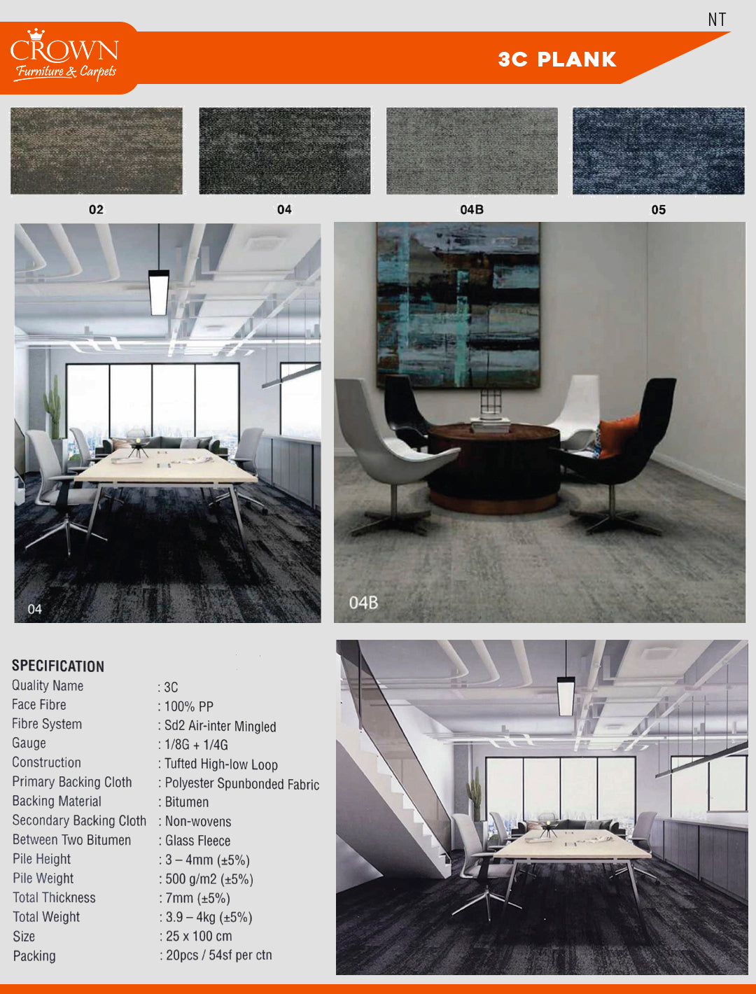 Featuring modularity and easy installation, Carpet Tiles are an excellent choice for demanding commercial spaces. Our 3C Plank range combines durable PP surfaces with eco-conscious backing for an affordable, lightweight flooring solution. The eco-back design reduces environmental impact while ensuring comfort and reliability.