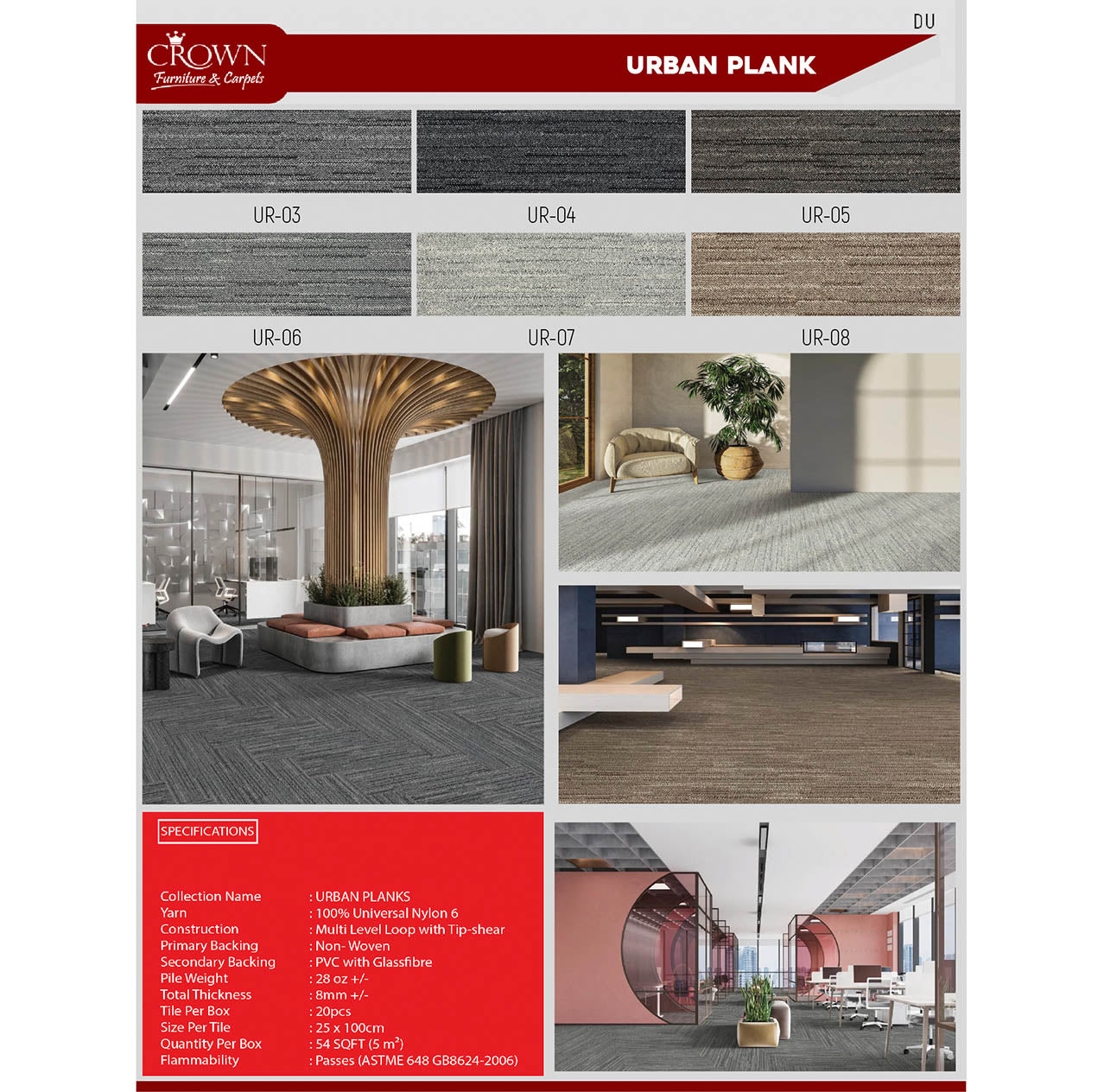 Carpet Tiles offer versatile, modular flooring with easy installation for commercial spaces with heavy foot traffic. Our Urban Planks range, featuring nylon and robust backing, provides superior durability, stain resistance, and vibrant colors. Perfect for spaces requiring functionality and style.