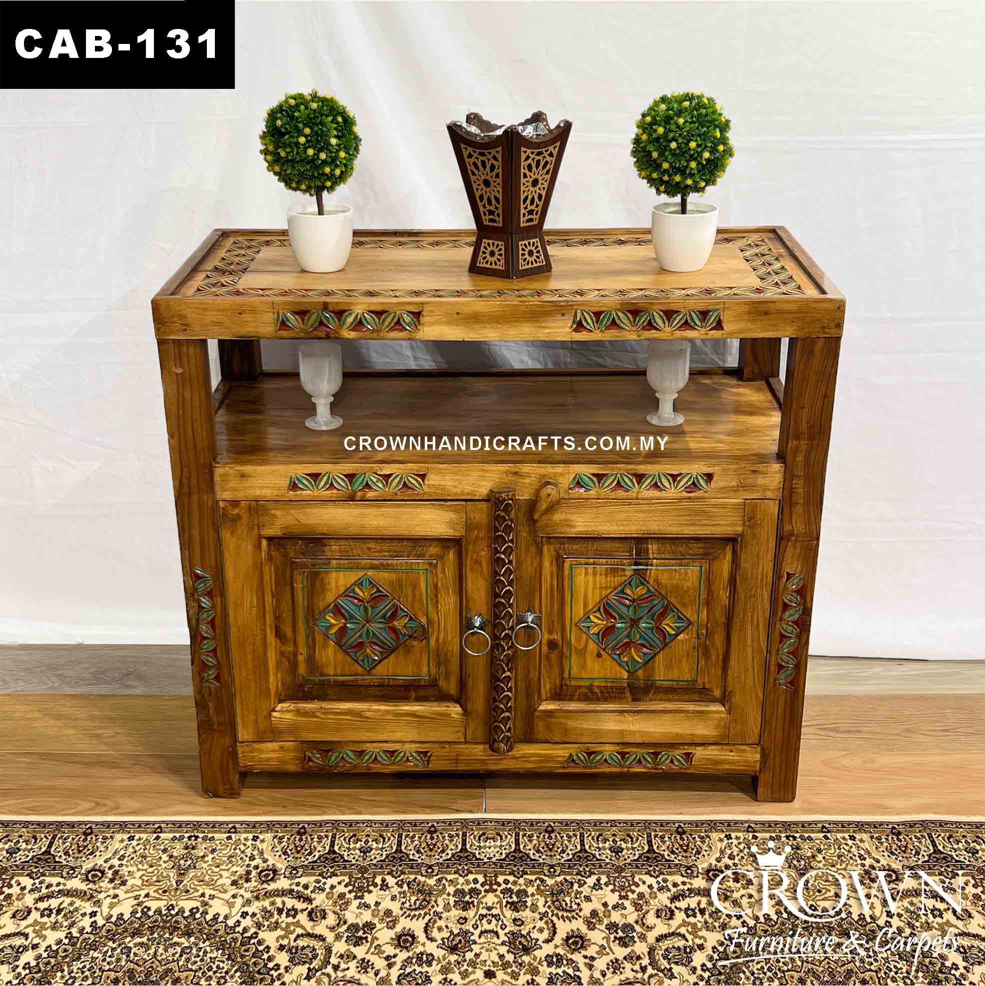 Elevate your home decor with this stunning Double Top Cabinet, featuring two doors and intricate hand-painted accents on the carvings. Designed to bring beauty and functionality to your space, this cabinet combines artistic craftsmanship with practical storage. The unique hand-painted details add a touch of color and elegance, making it a perfect addition to any room in your home. Crafted from solid wood, it promises durability while enhancing your interior with its timeless design. Discover this exquisite piece to complement your home at our furniture shop.