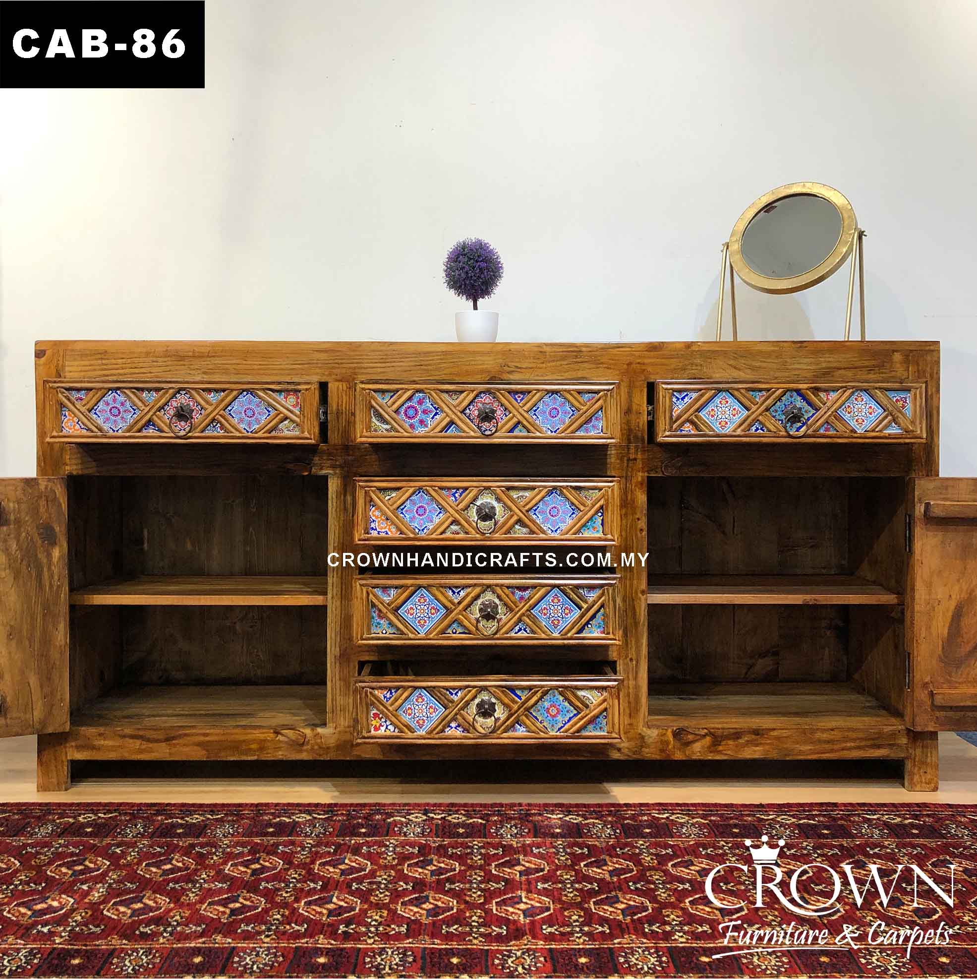 Add a touch of artistic elegance to your space with this Antique Cabinet, featuring a Boho accent diamond shape design meticulously hand-painted by skilled artisans. Crafted from solid wood, this cabinet combines durability with eye-catching style, making it a perfect addition to your living or dining room. Its spacious interior provides ample storage for decor, linens, or essentials, while the intricate detailing enhances its charm. Available at our Solid Wood Furniture Store in Malaysia, this cabinet is a blend of craftsmanship and functionality, ideal for elevating your home decor.