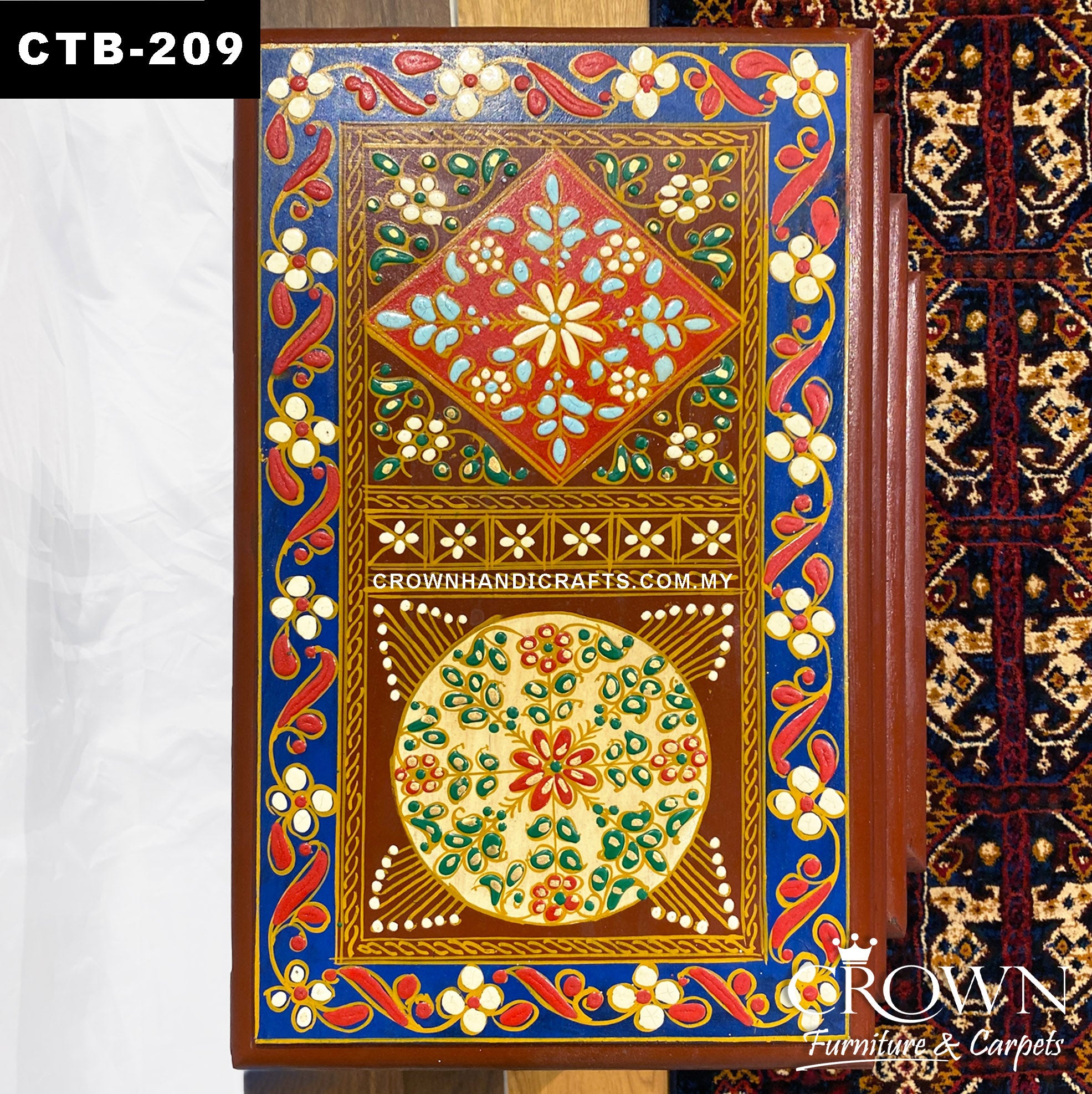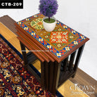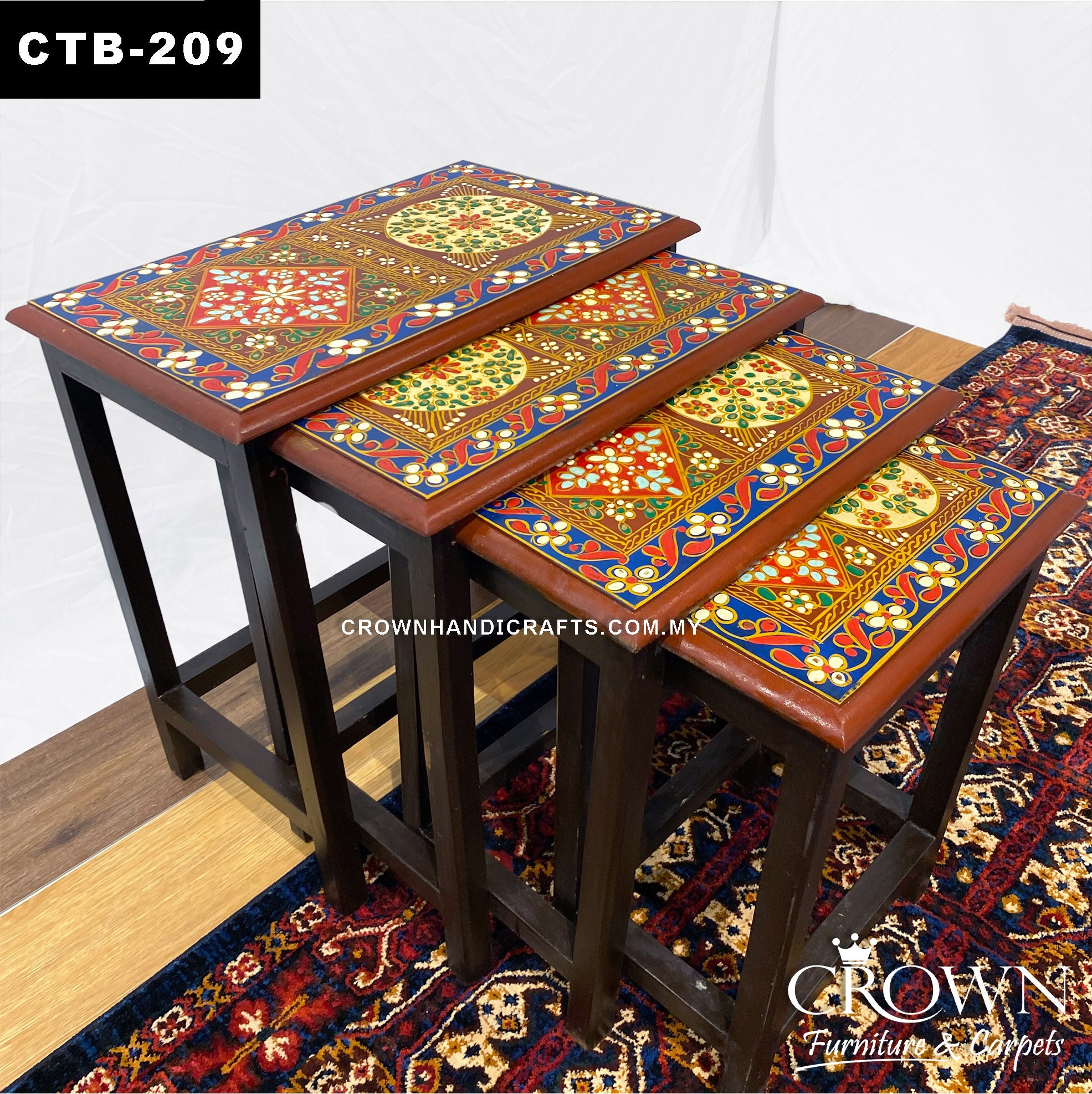This set of four nesting tables showcases exquisite hand-painted art from Rajasthan, India, featuring vibrant traditional designs that bring a burst of color and cultural charm to any room. Versatile and space-saving, the tables can be nested together when not in use or separated as individual side tables—perfect for your living room, lounge, or bedroom. Meticulously crafted with intricate detailing, they blend functionality with artistic beauty. A stunning addition to your home décor, these tables are as practical as they are a celebration of skilled craftsmanship.