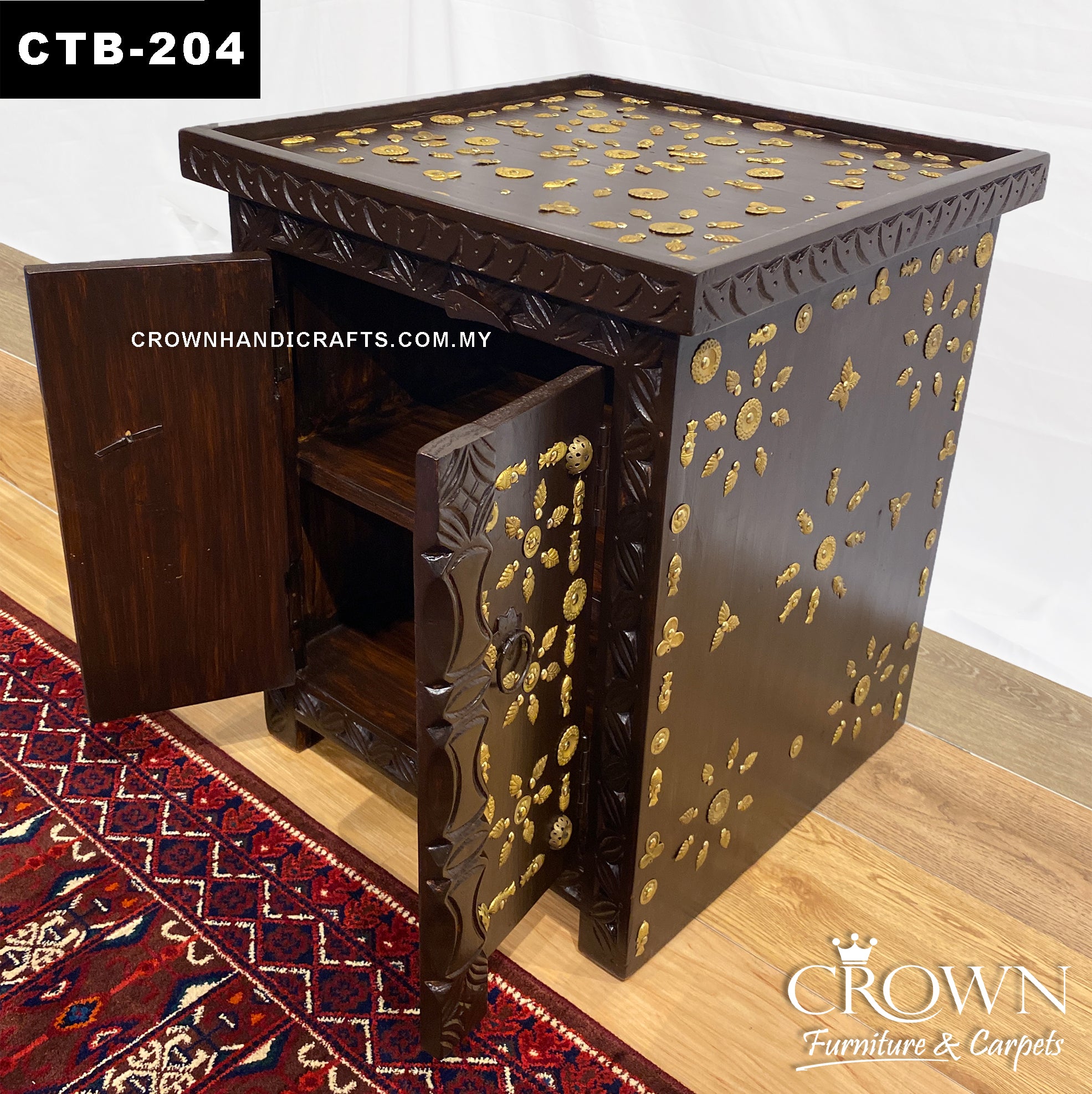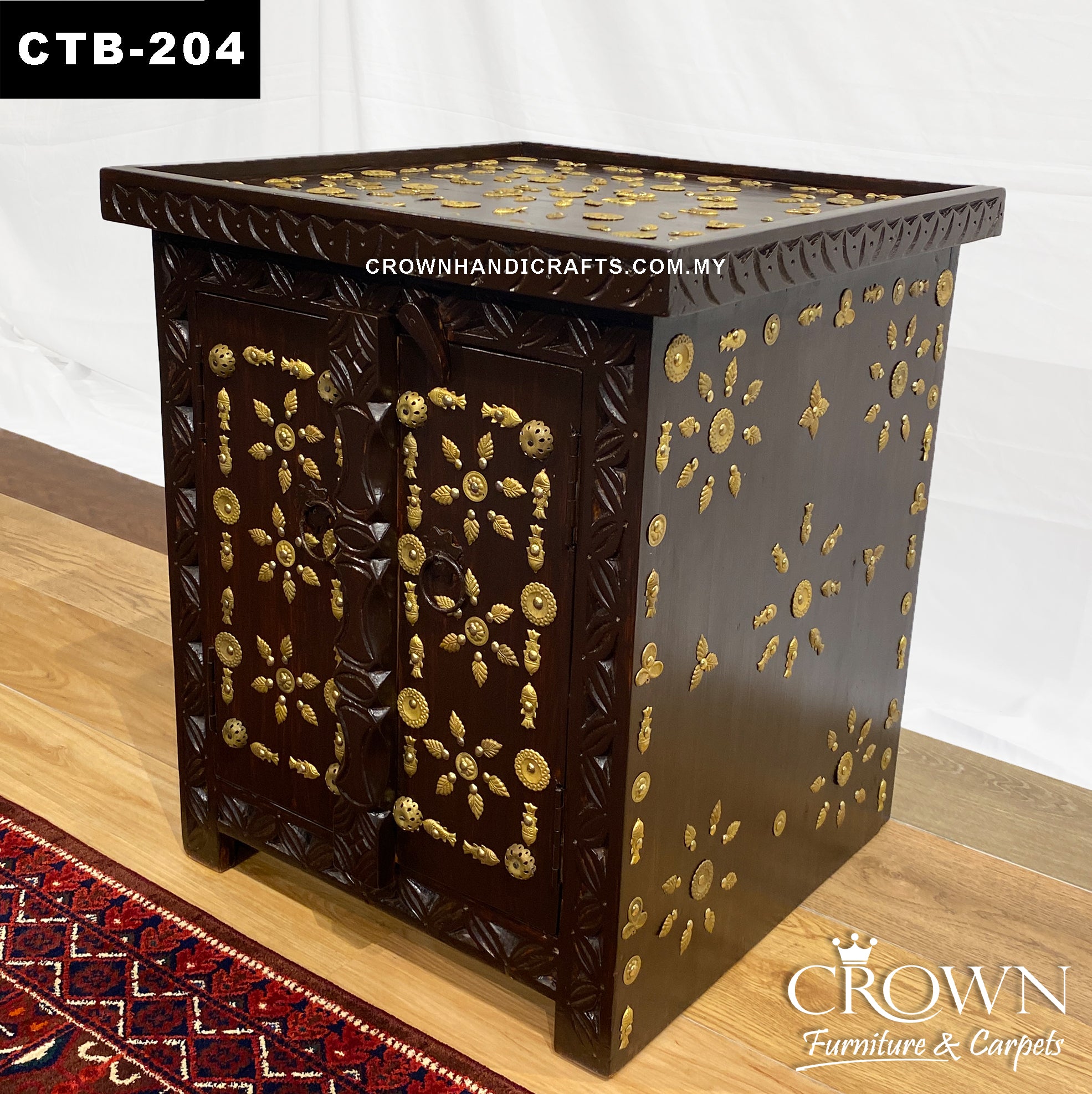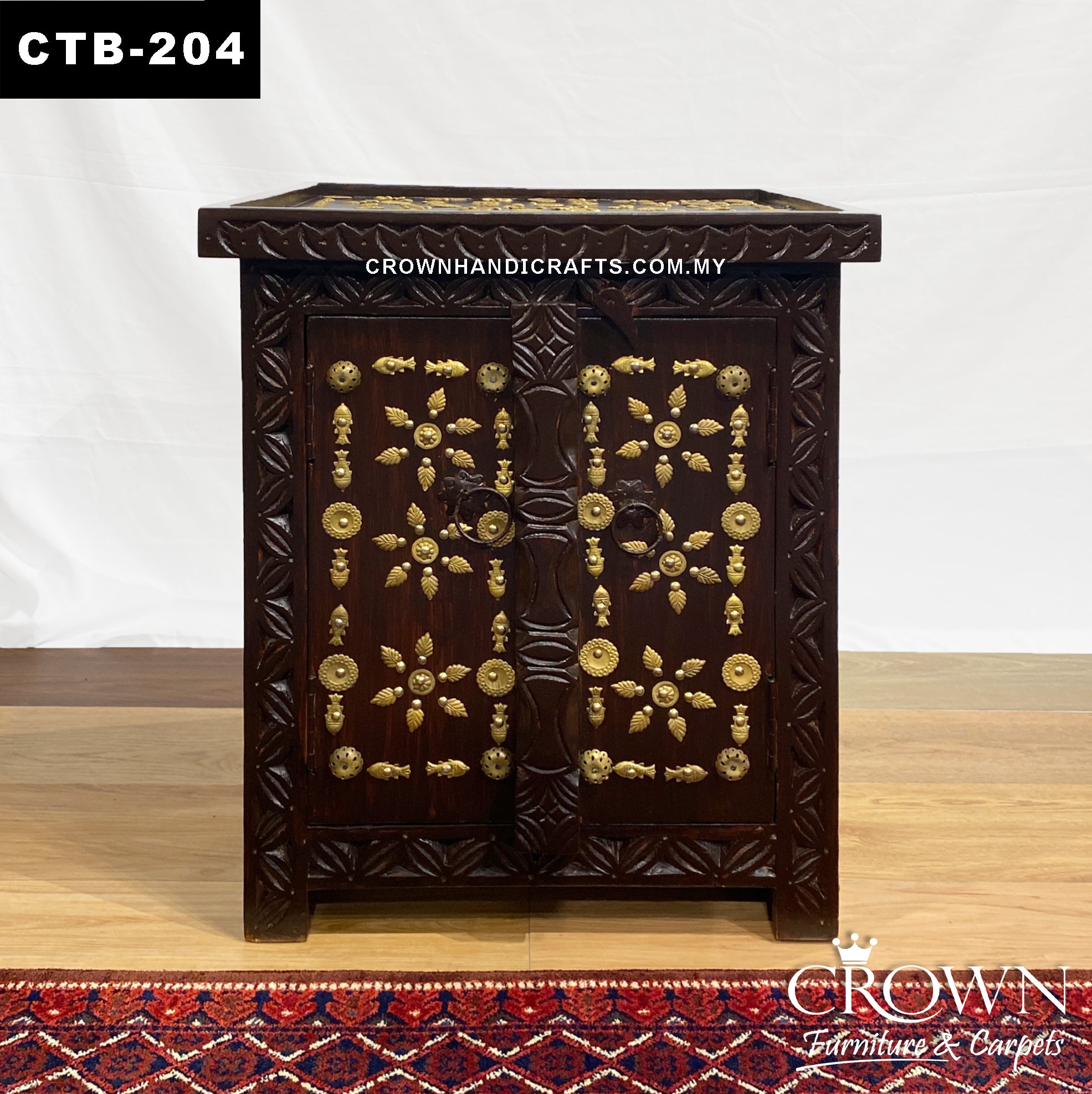 This side table is designed to impress with its exquisite brass accents that enhance the piece's beauty and charm. The table features two doors with a wooden latch for convenient storage, making it a perfect blend of practicality and elegance. Crafted from solid wood, it offers durability and a rich, timeless appeal. Ideal for creating a stunning focal point in your room, this table is not just functional but also a statement piece that adds character and style to your home.