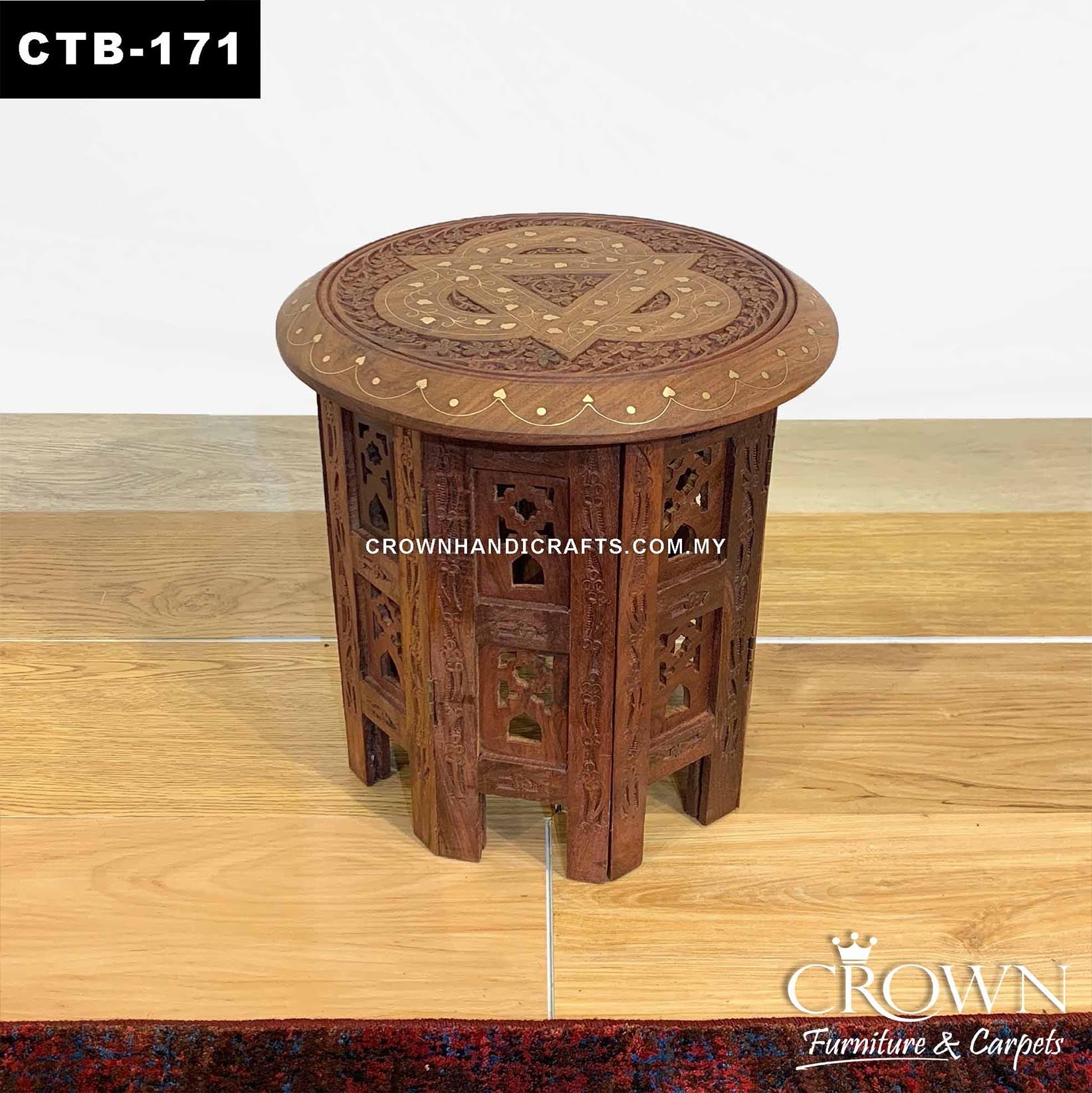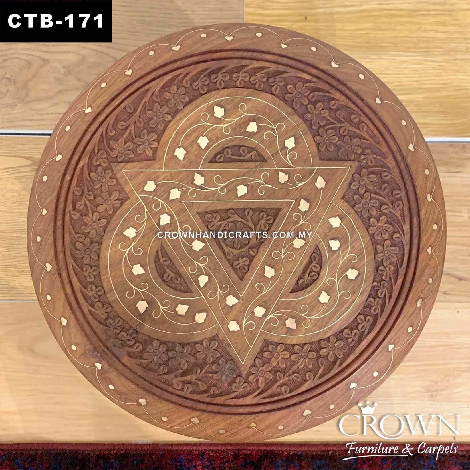 Solid Wood Stool Side Table Kashmiri Indian Craft, Amazing Hand Carving and Brass Inlay | CTB-171 (D12 H12.5 Inches)