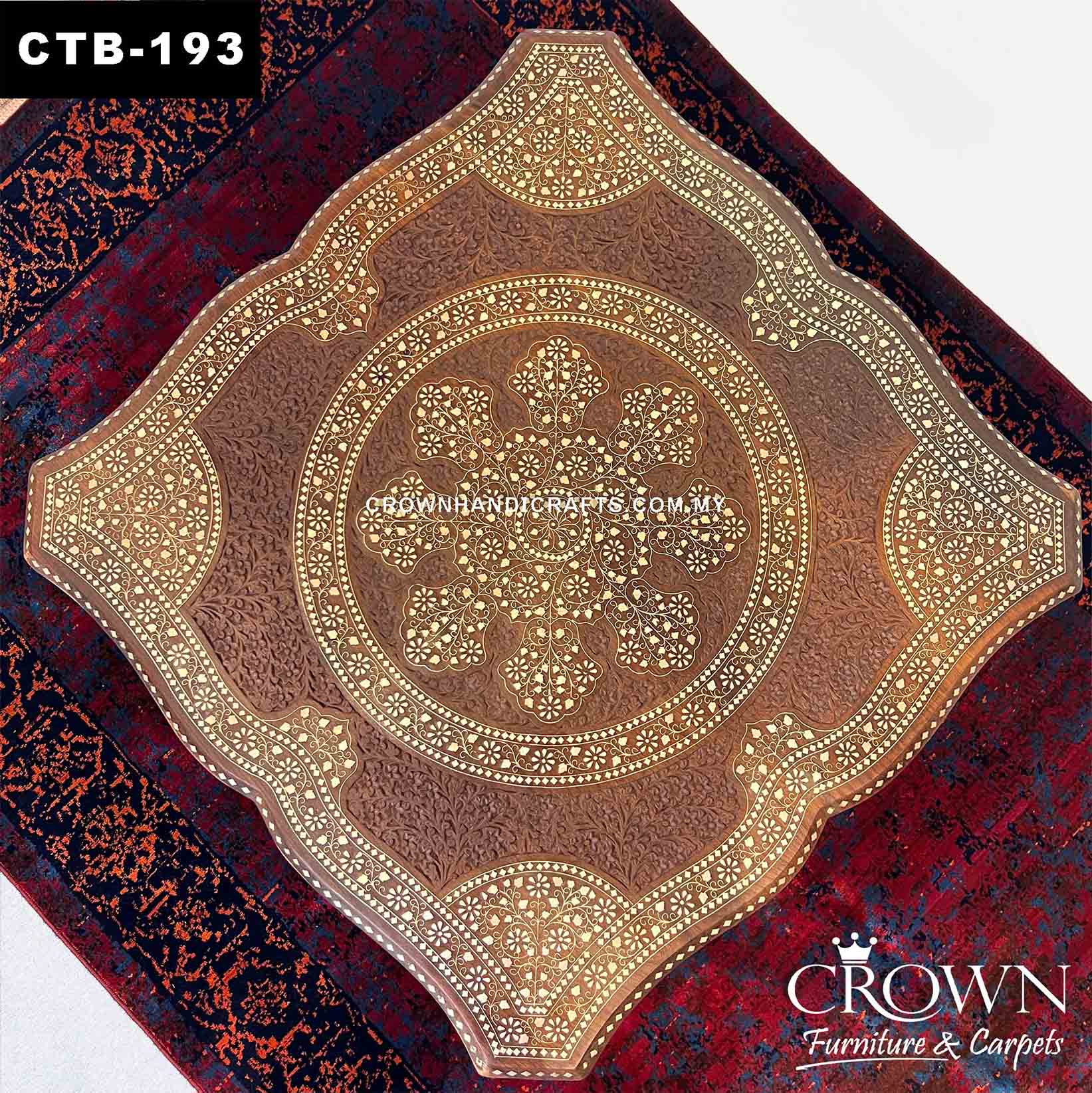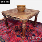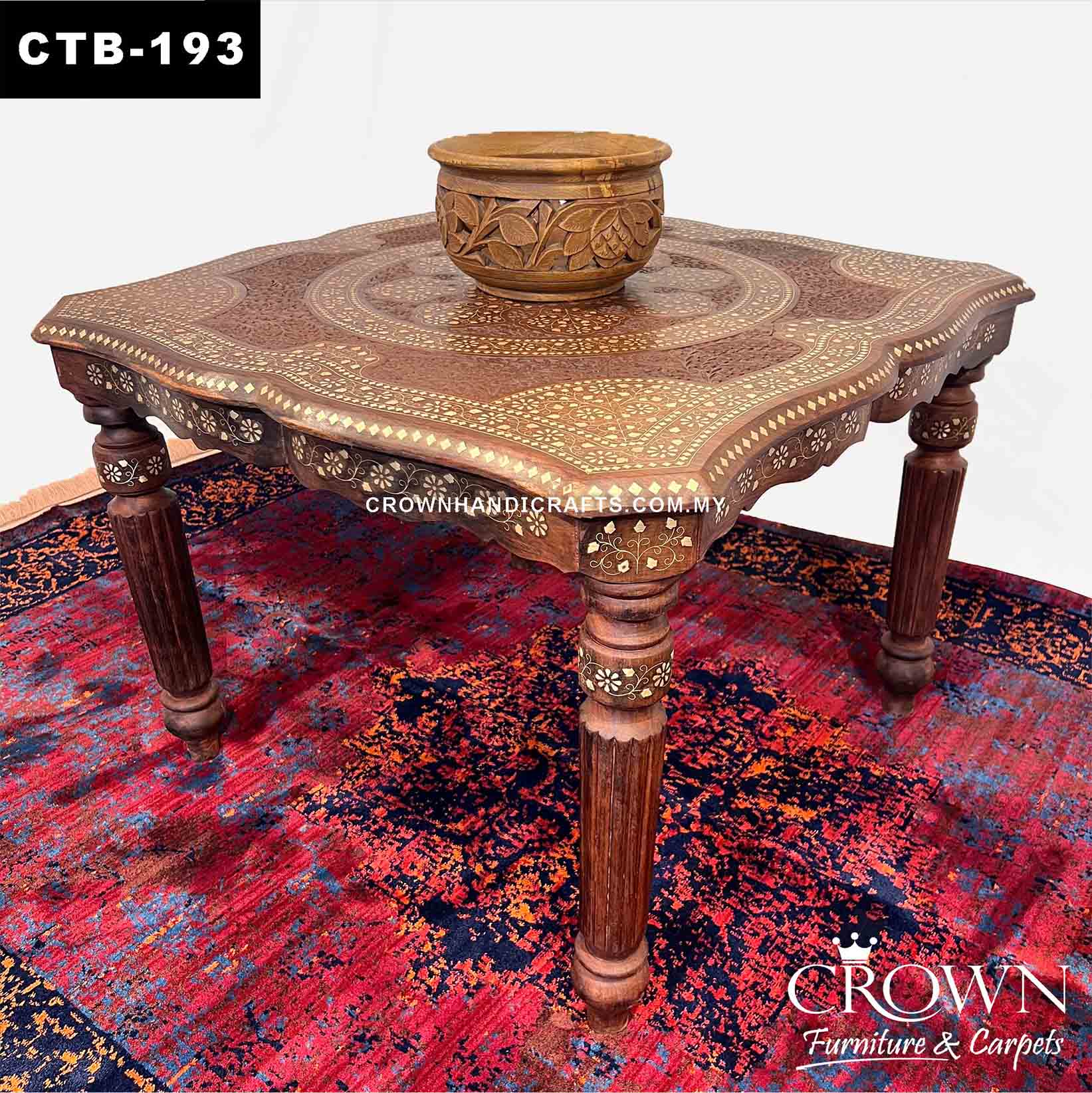 This square Kashmiri Indian coffee table is an exquisite blend of tradition and elegance, crafted from solid wood. The artistic brass inlay on the surface adds a stunning visual appeal, while the hand-carved details showcase exceptional craftsmanship. Perfect for adding a touch of cultural richness to your living room, this coffee table is not just a functional piece, but also a work of art that enhances any space with its intricate designs and luxurious finish. A timeless piece that embodies the beauty of Indian craftsmanship.