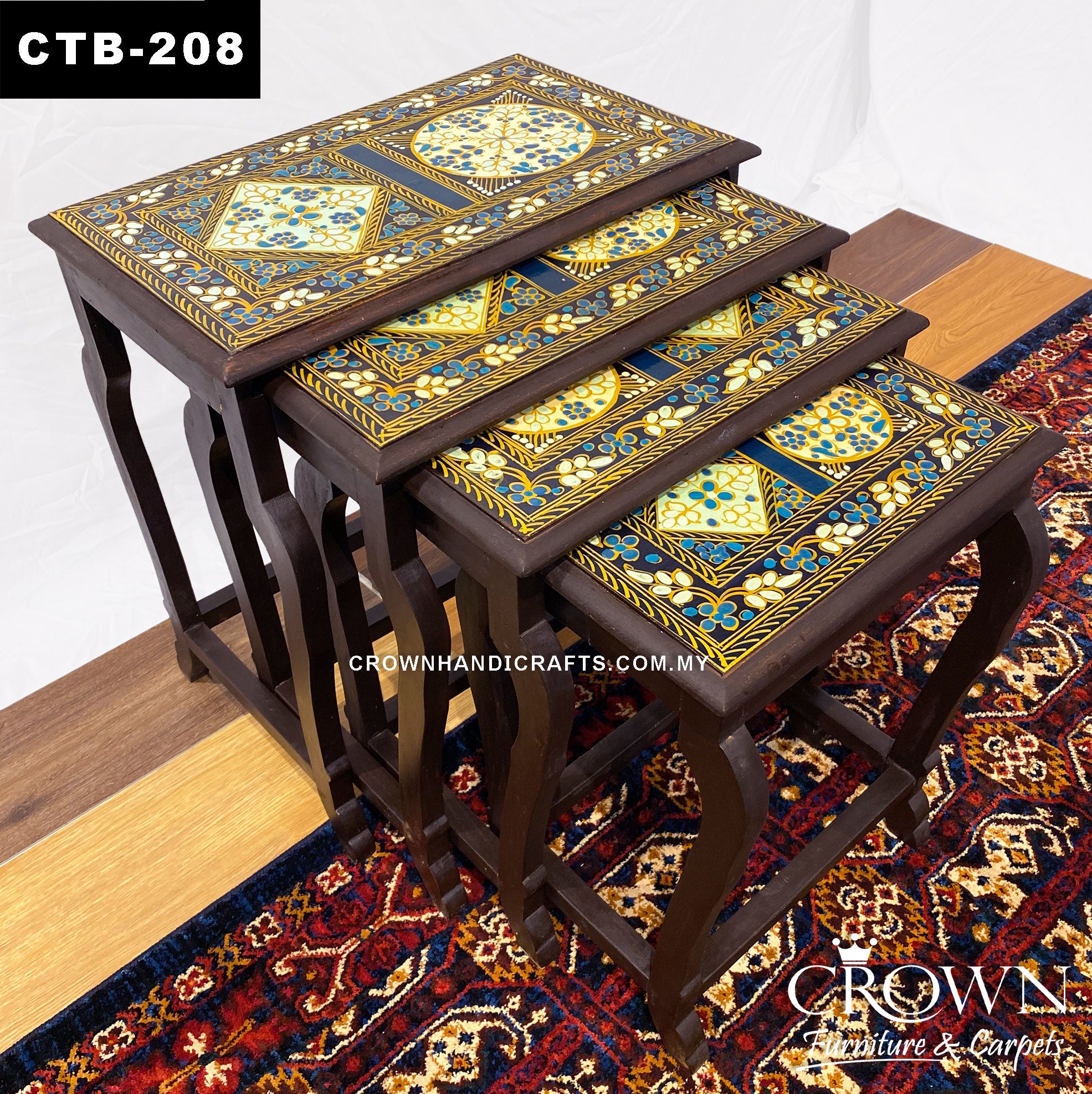 This set of four nesting tables showcases exquisite hand-painted art from Rajasthan, India, featuring vibrant traditional designs that bring a burst of color and cultural charm to any room. Versatile and space-saving, the tables can be nested together when not in use or separated as individual side tables—perfect for your living room, lounge, or bedroom. Meticulously crafted with intricate detailing, they blend functionality with artistic beauty. A stunning addition to your home décor, these tables are as practical as they are a celebration of skilled craftsmanship.