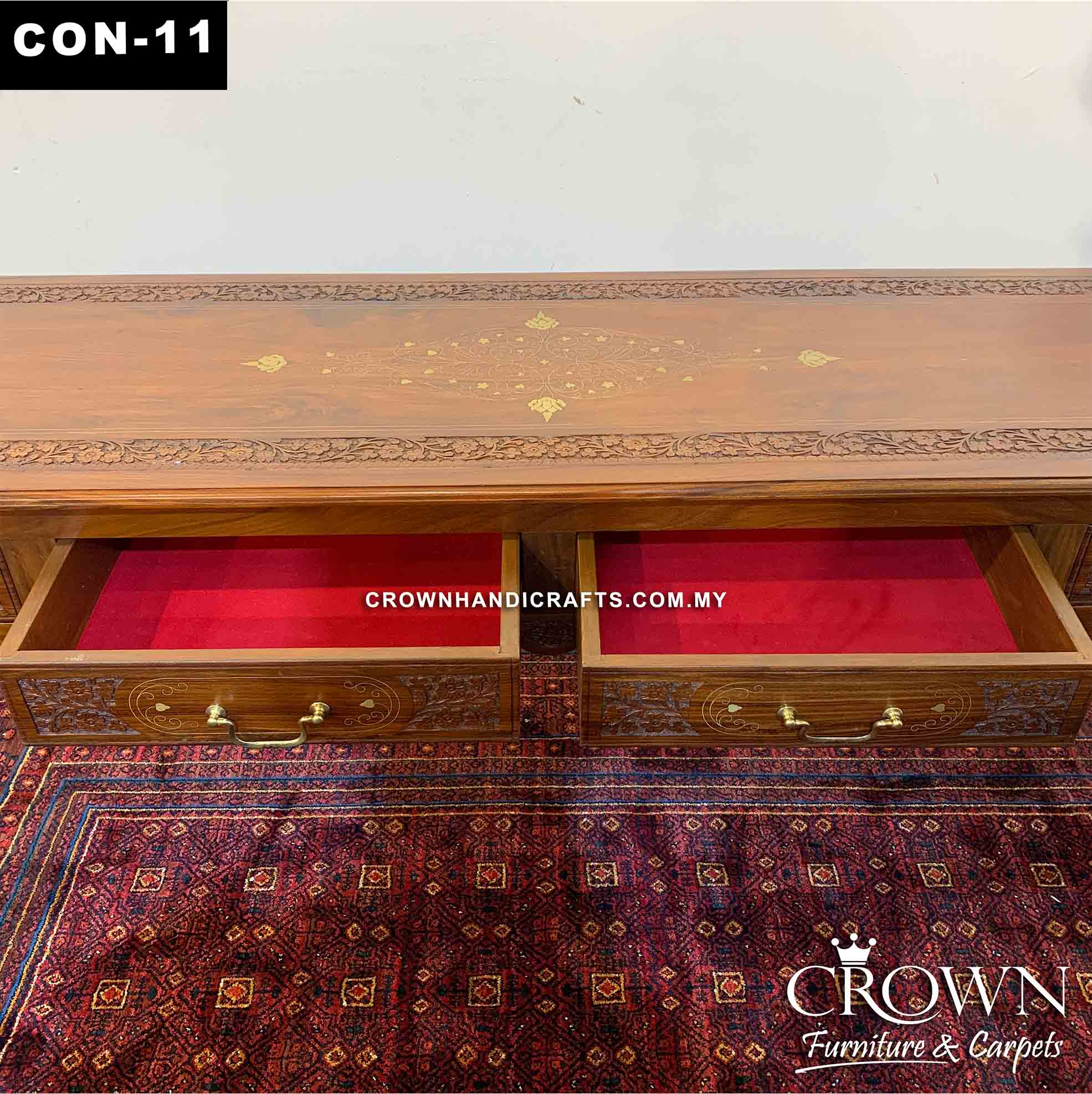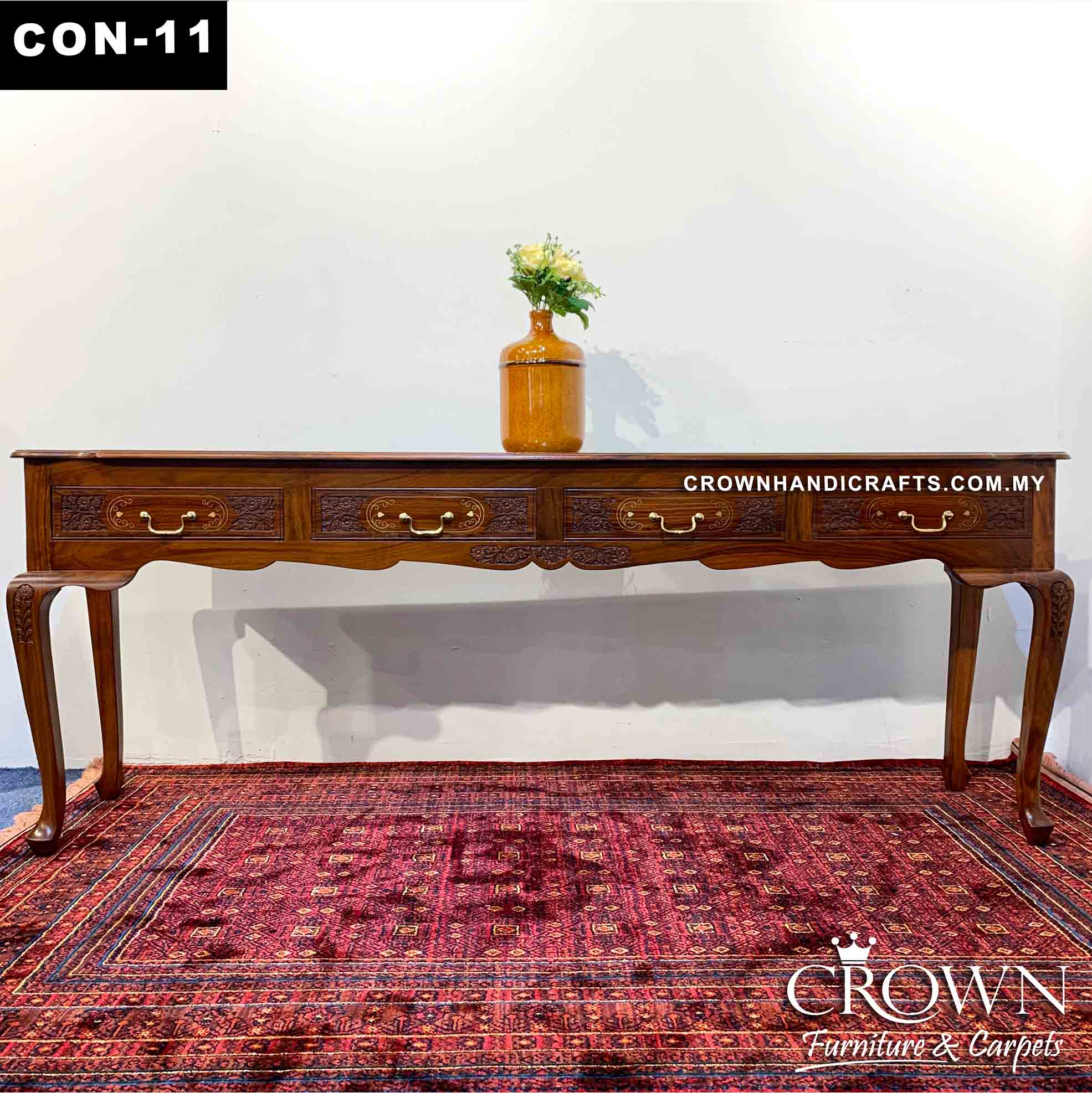 Victorian Style Long Console Table and Sofa Table, Featured with Hand Carving and Brass Inlay | Solid Wood Entrance Console Table in Malaysia | CON-11 (L78 W18 H30 Inches)