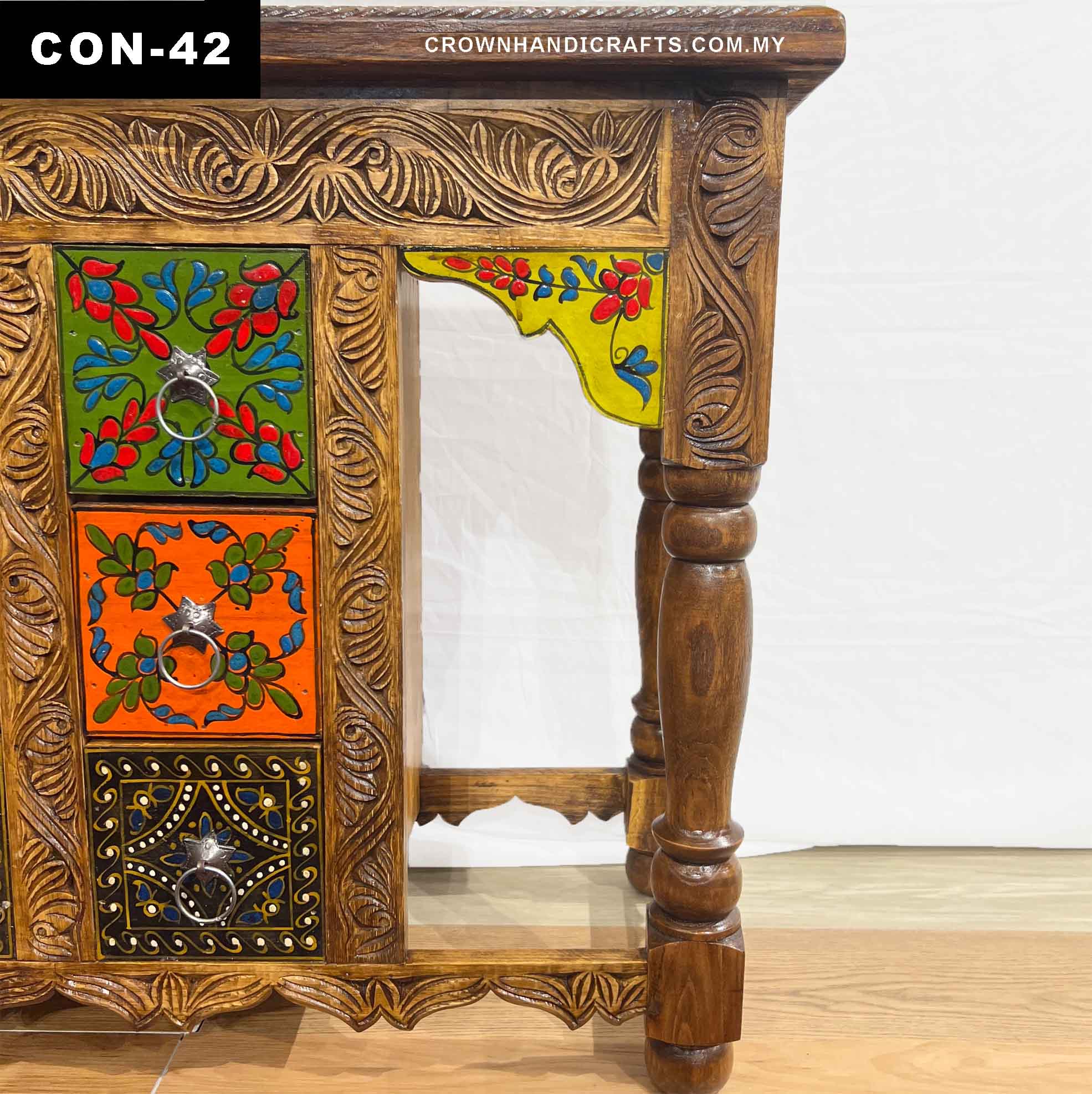This console table combines vibrant hues of timeless art with the elegance of solid wood, creating a stunning statement piece for your entrance or living room. Featuring handcrafted details, this table exudes a unique charm that blends artistic expression with functional design. The carefully selected colors and intricate craftsmanship bring a sense of vibrancy and sophistication, making it the perfect addition to any home seeking both style and substance. Enhance your space with this decorative yet practical furniture that radiates crafted elegance.