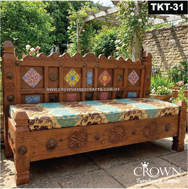 Majestic Day Bed Takht Throne Style, Solid Wood Exquisite Hand-Carving for Your Living Space | Added Comfort with Fabric Cushion, Bolsters and Pillows | Timeless Wooden Day Bed Furniture | TKT-39 (L85 W39 H39.5 Inches)