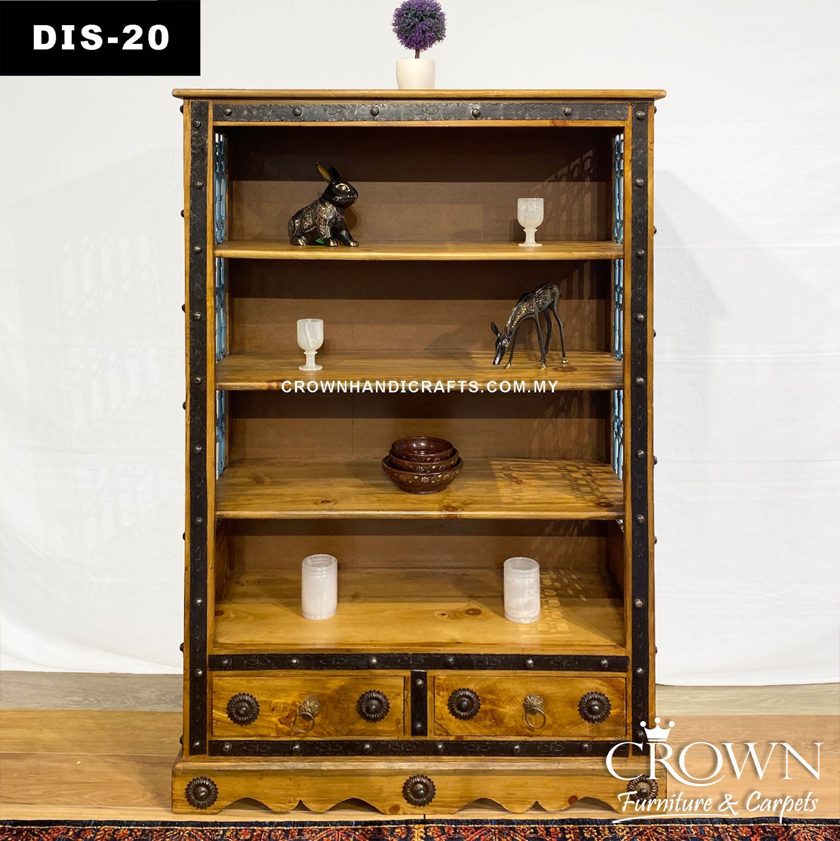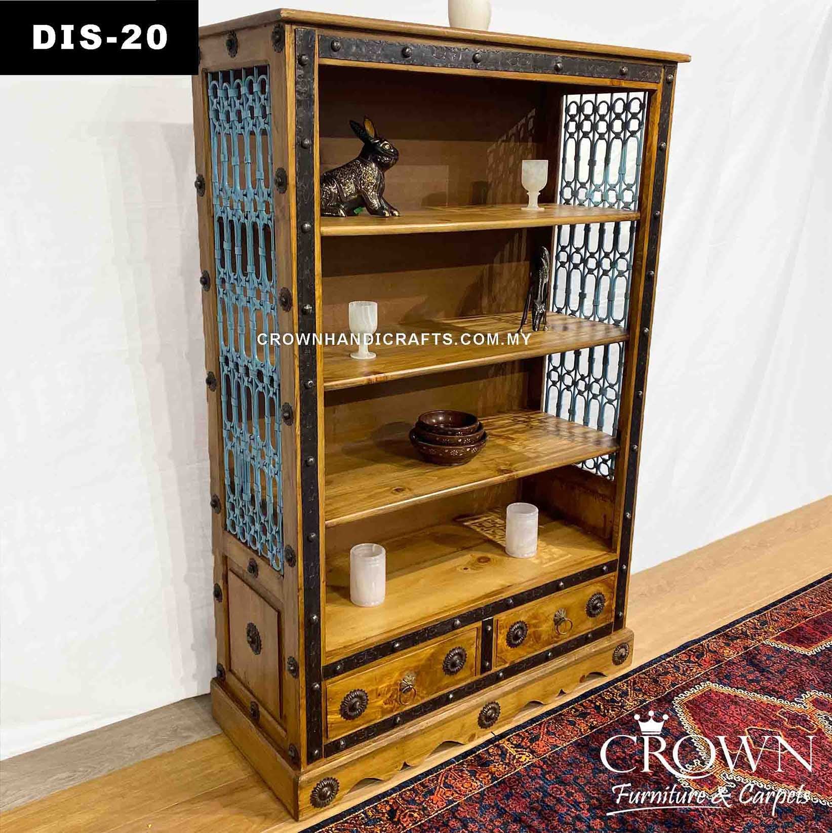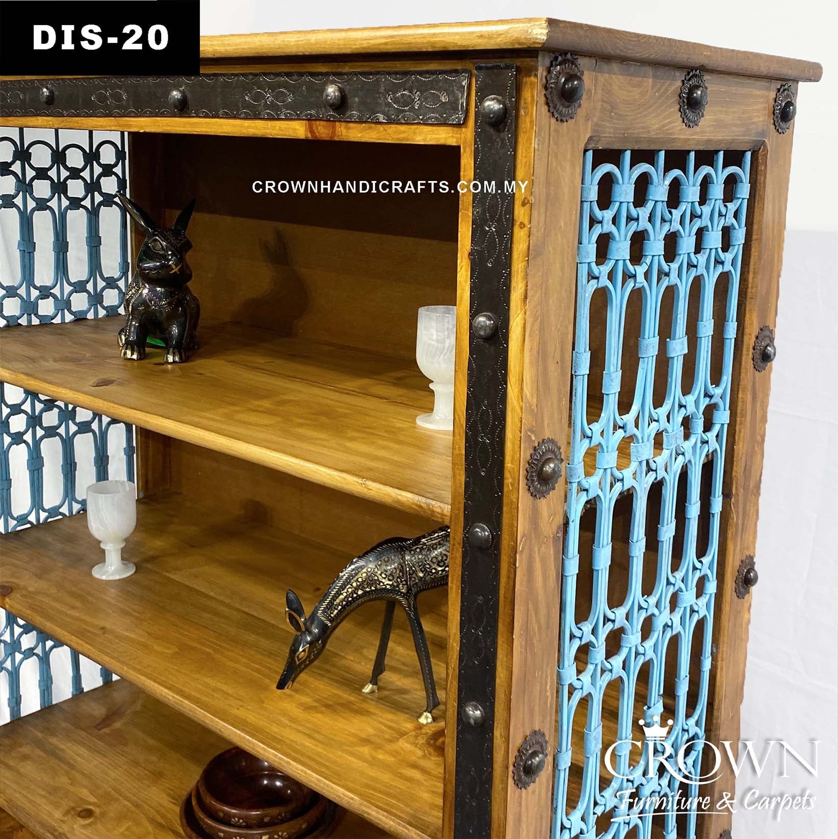 Elegant Solid Wood Display Shelf Cabinet for Living Room | Featured with Metal Ornament and Blue Metal Jali for Timeless and Modern Charm | DIS-20 (L43 W18.5 H66 Inches)
