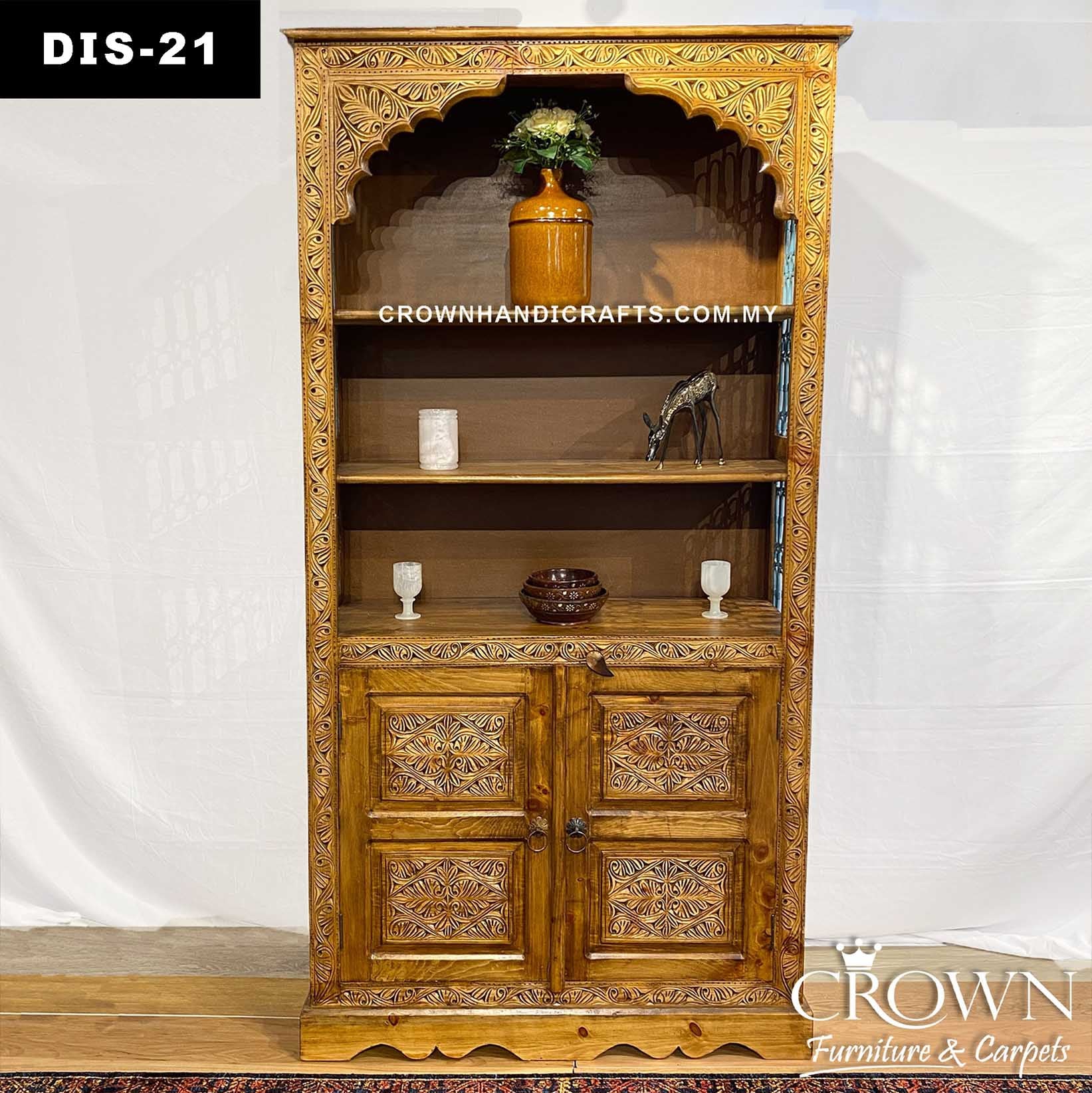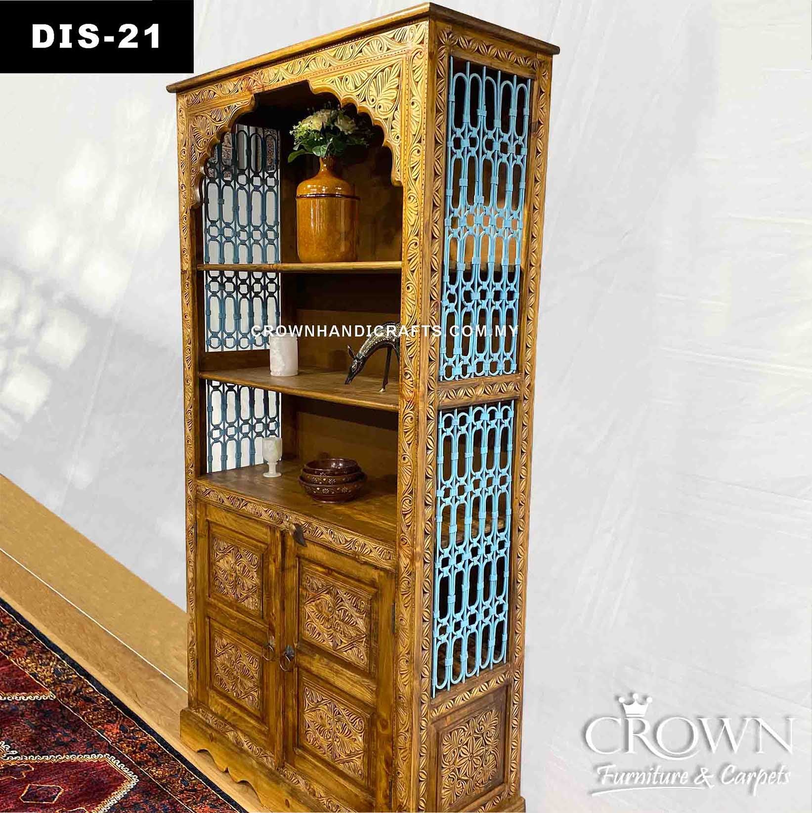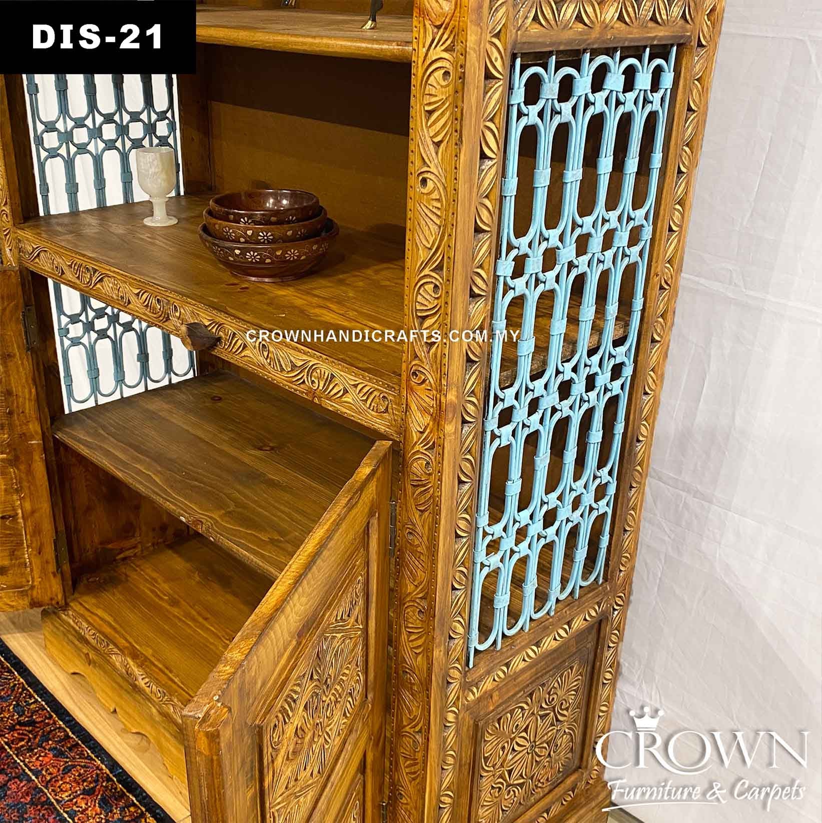 Vintage Style Wood Display Shelf Cabinet with 2 Doors | Accent with Hand Carving and Blue Metal Jali adding a touch of Timeless and Modern sophistication | DIS-21 (L43.5 W18.5 H84 Inches)