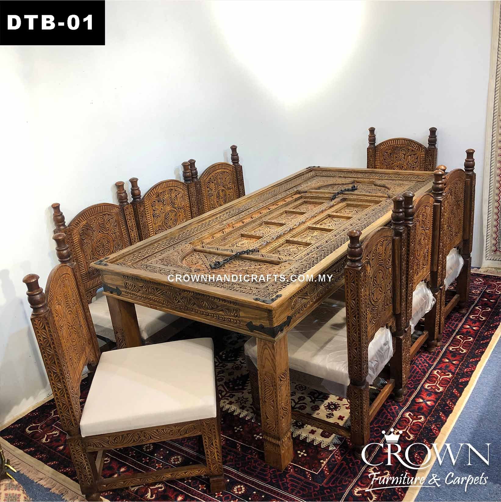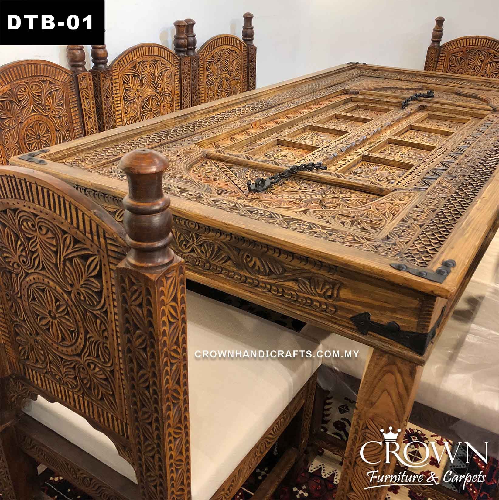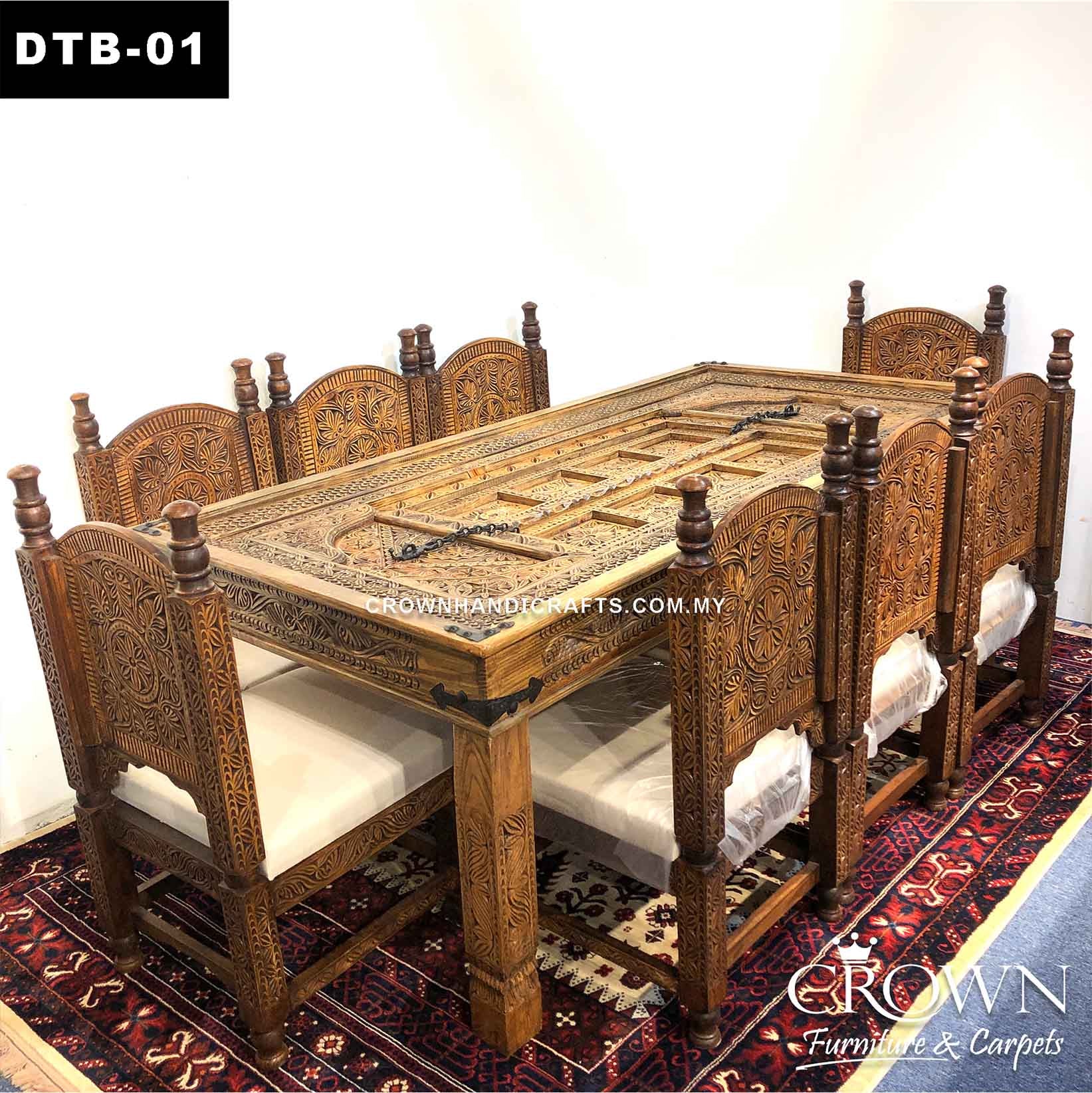 Dining Table Antique Indian Haveli Palace Door Design, Featured with Hand Carving and Metal Latch Accent | Solid Wood Dining Table accommodates 6 to 8 chairs | DTB-01 (L84 W48 H30 Inches)
