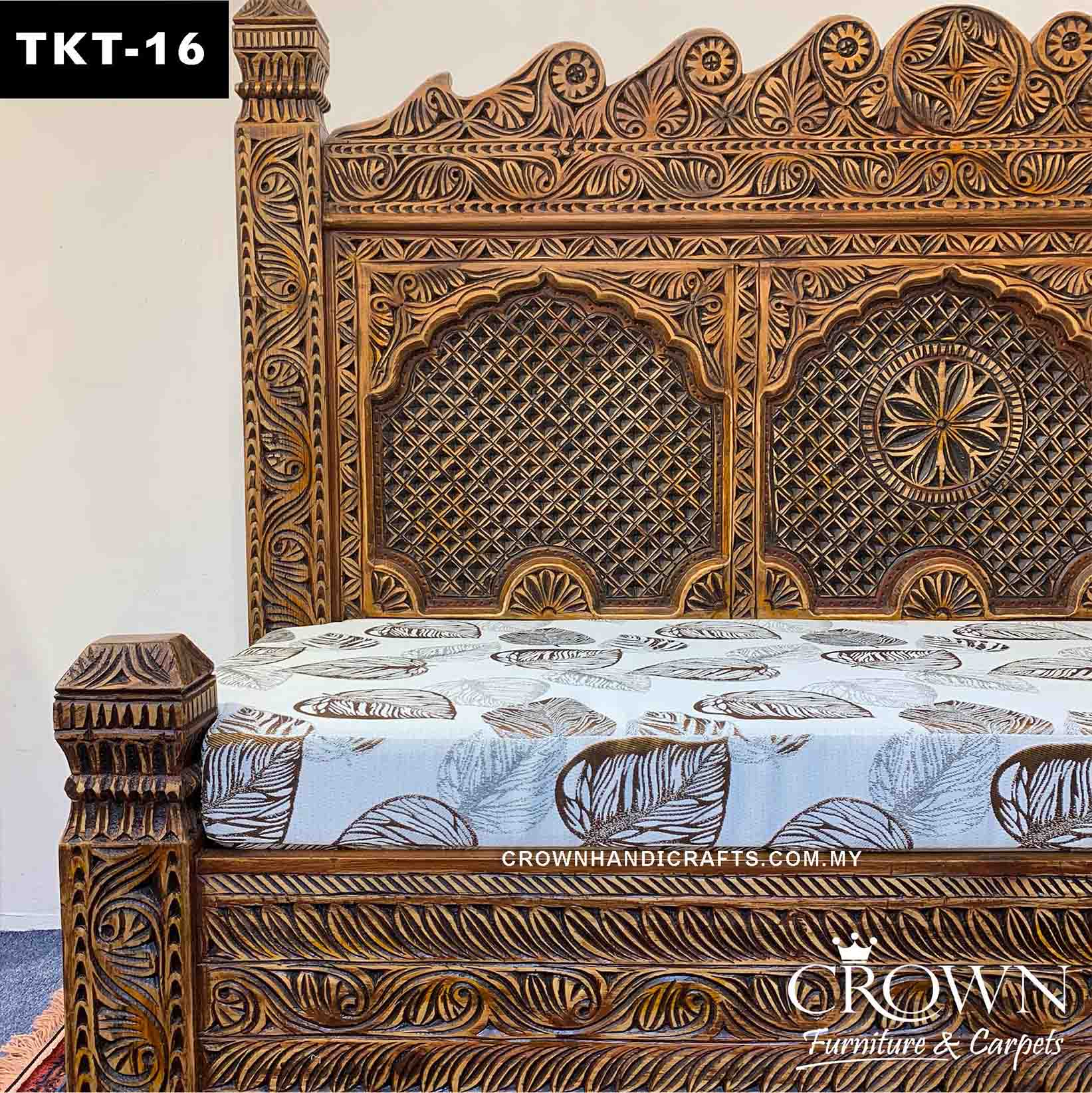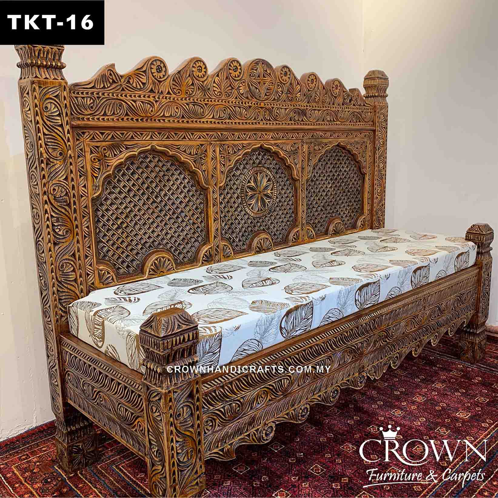 Bring the grandeur of Indian palace aesthetics to your living room with this exquisite Takht-style 3-seater couch, inspired by the intricate impressions of antique palace windows. Crafted from solid wood, this piece seamlessly combines traditional elegance with practical comfort. The detailed hand-carving on the frame and its stately dimensions (L61 W24 H51 inches) make it a show-stopping centerpiece for your home. Perfect for creating an air of regal sophistication, this sofa couch is a must-have for those who appreciate timeless design and artisanal craftsmanship.