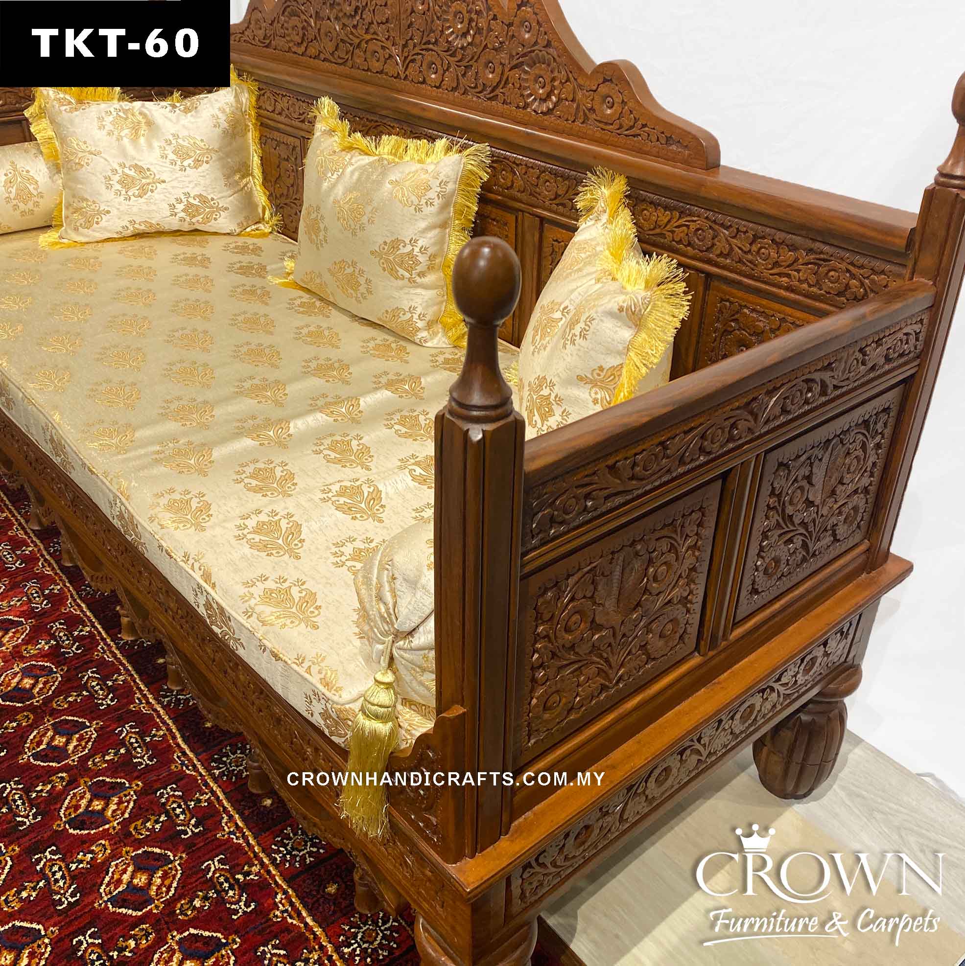 Throne-Design Takht Couch 3 Seater, Solid Wood Hand-Carved Elegance for a Living Room Makeover | Added Comfort with Fabric Cushion, Bolsters and Pillows Wooden Sofa for Living Room | TKT-60 (L72.5 W27 H39 Inches)