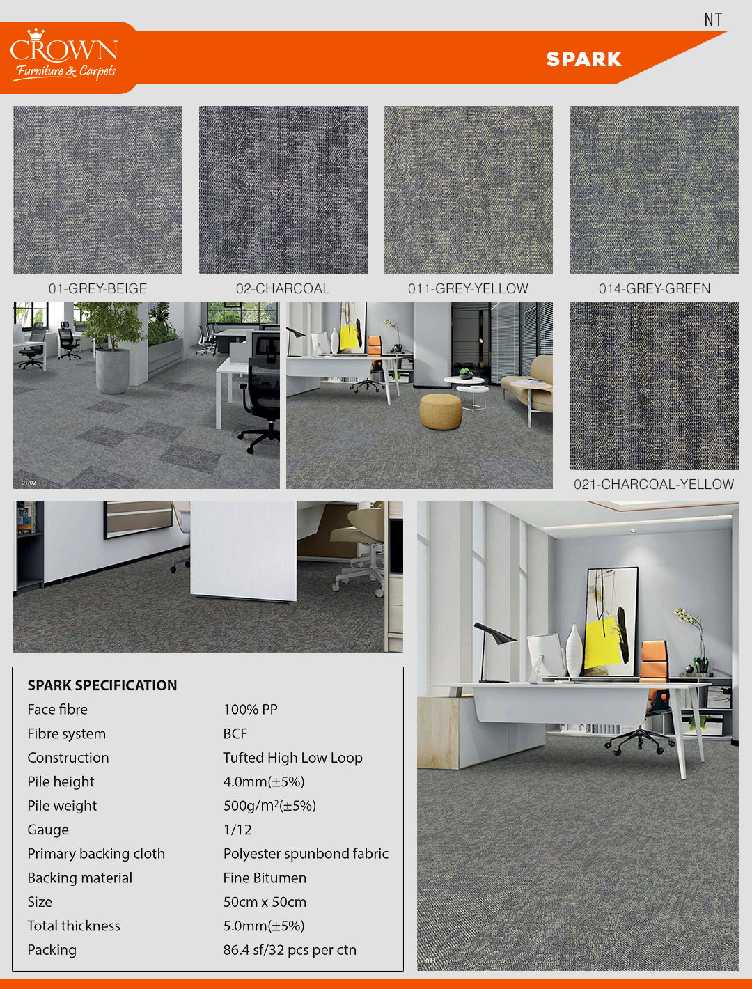 Transform your space with Spark Carpet Tiles, offering superior durability, quick installation, and an eco-conscious design. The PP surface and eco-back technology ensure long-lasting comfort and performance.