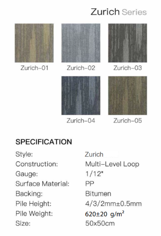 Achieve a modern, professional look with Zurich Carpet Tiles, featuring a lightweight, cost-efficient, and easy-to-install modular design. Their PP surface and eco-friendly backing ensure durability and comfort.