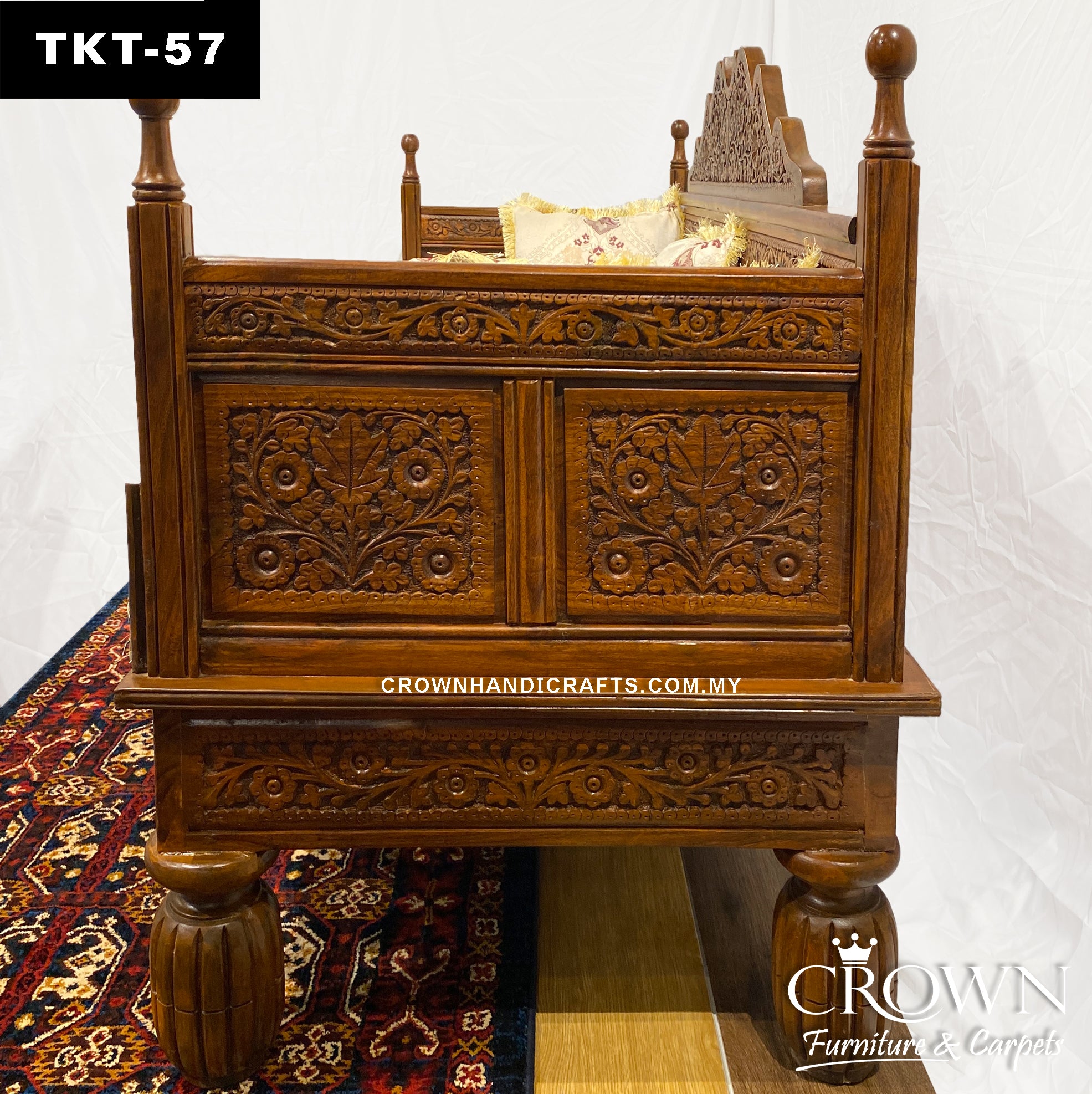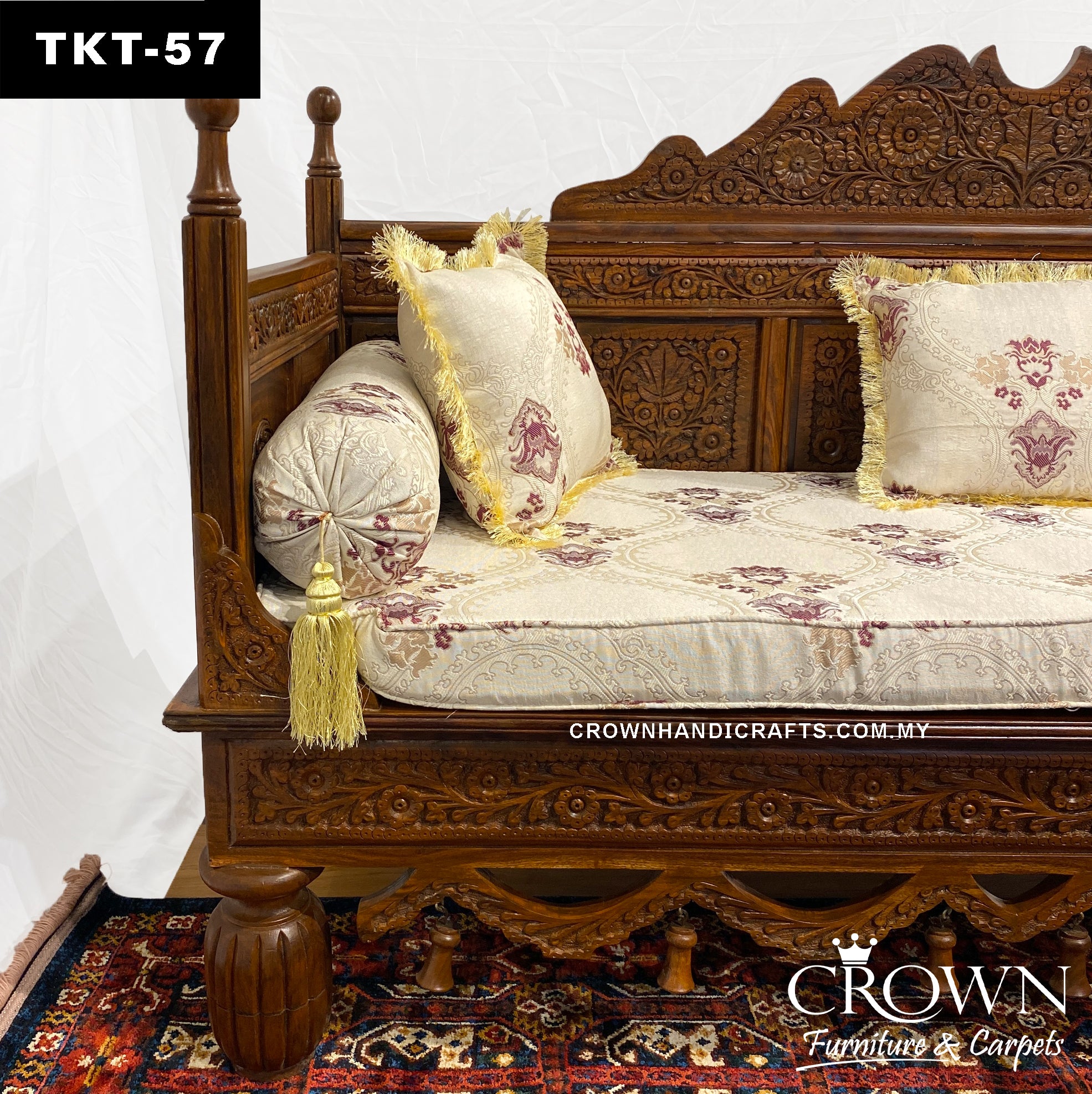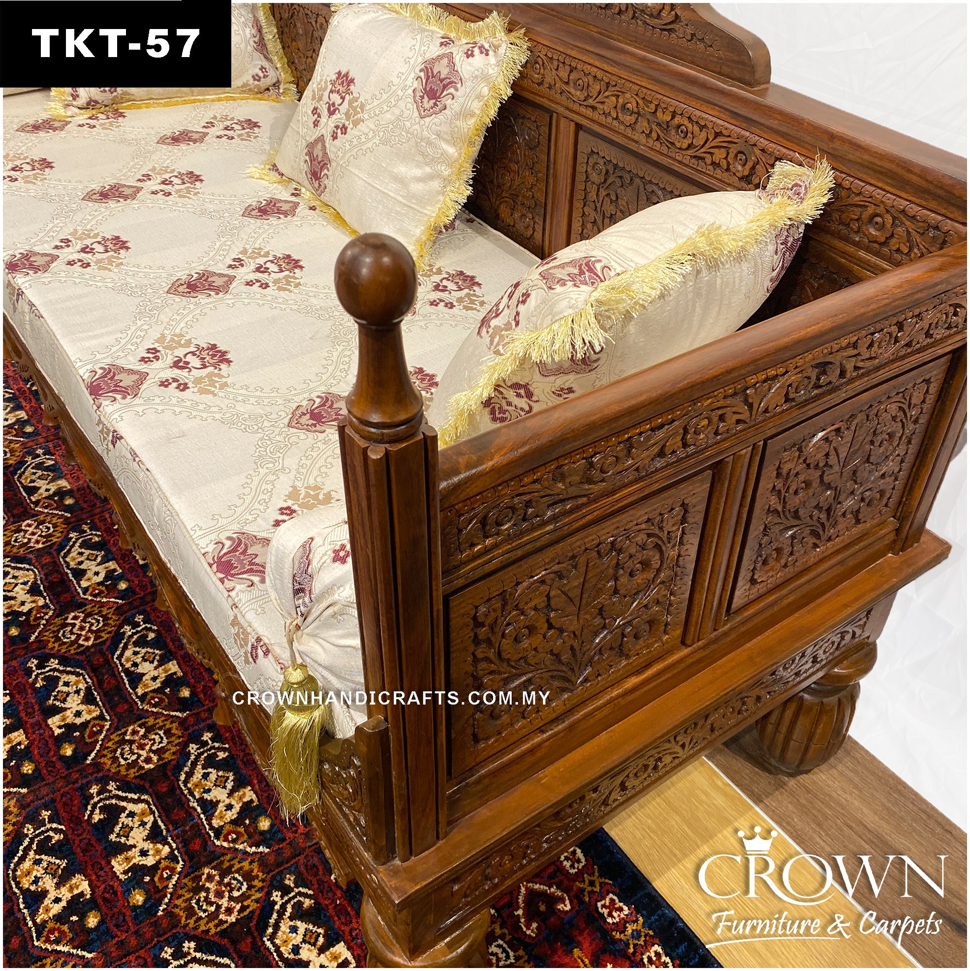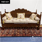 Artfully Hand-Carved 3-Seater Royal Takht-Throne Sofa in Solid Wood, Complete with Plush Cushions and Pillows | Elevate Your Living Room with Timeless Comfort & Royal Elegance | TKT-57 (L72 W27 H40 Inches)