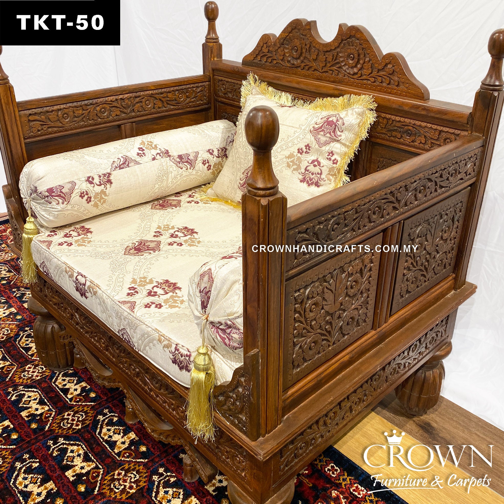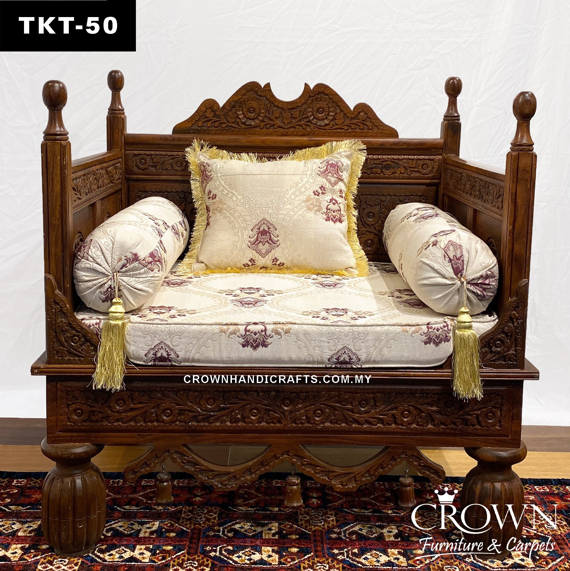 Hand-Carved Solid Wood Throne Sofa: Elegant Single-Seater Takht for Living Room Makeovers | Plush Fabric Cushions & Pillows for Added Comfort | TKT-50 (L36 W27 H37 Inches)