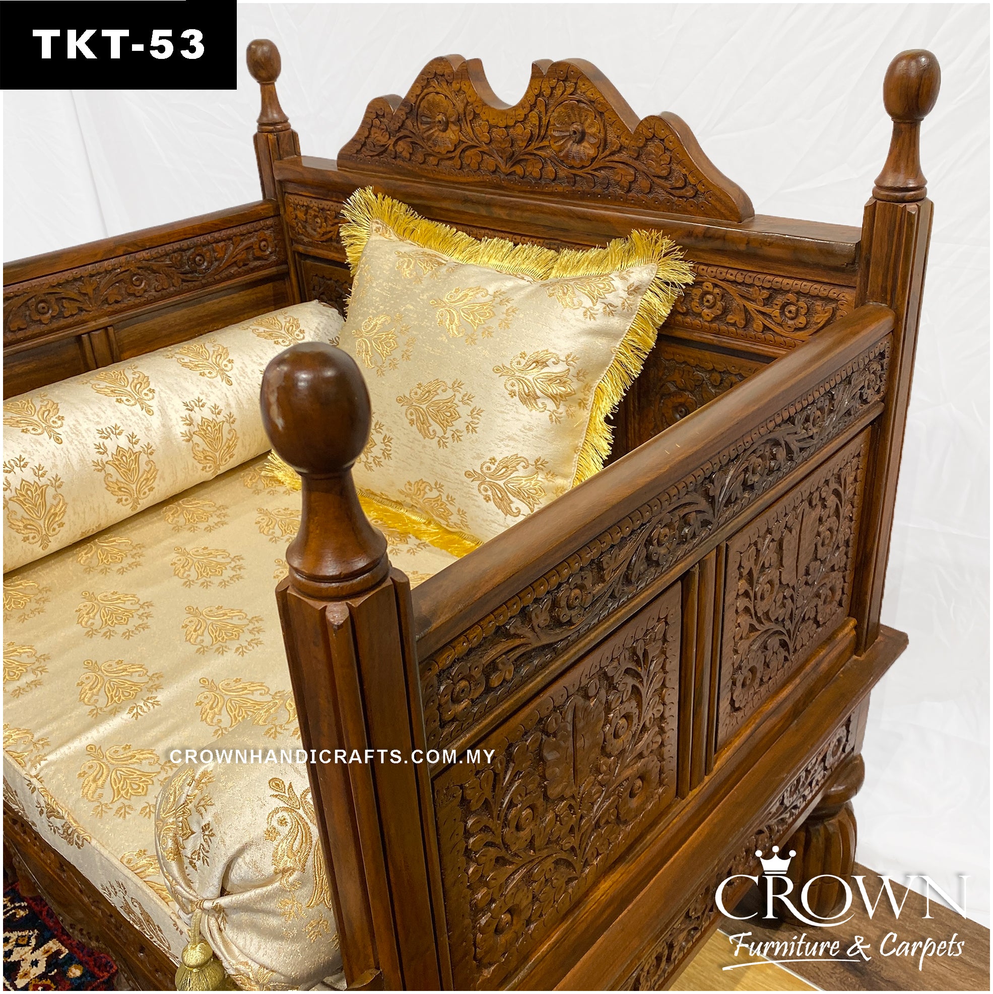 Hand-Carved Solid Wood Throne Sofa: Plush Takht with Pillows for Living Room Elegance | TKT-53 (L36 W27 H37 Inches)
