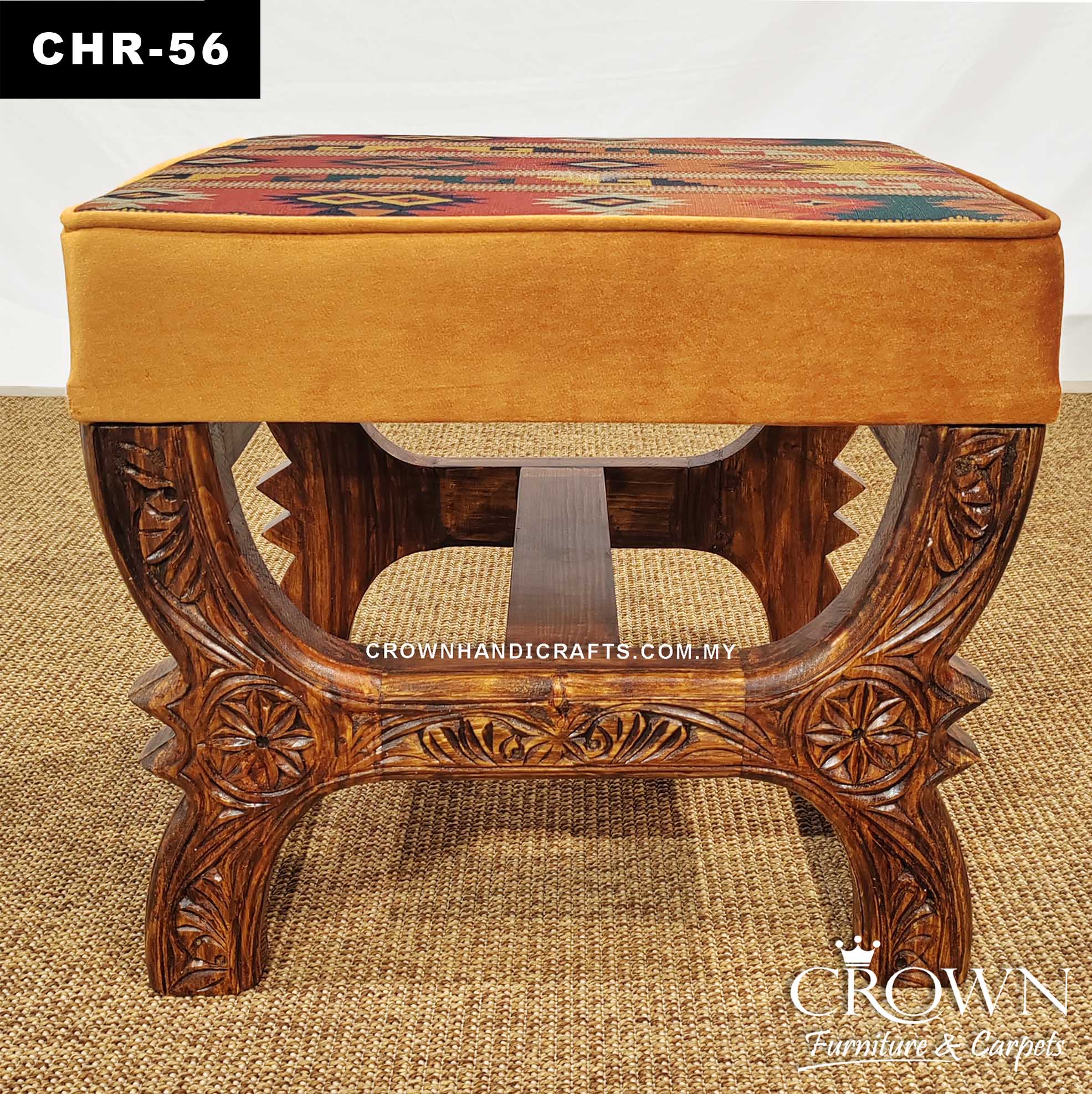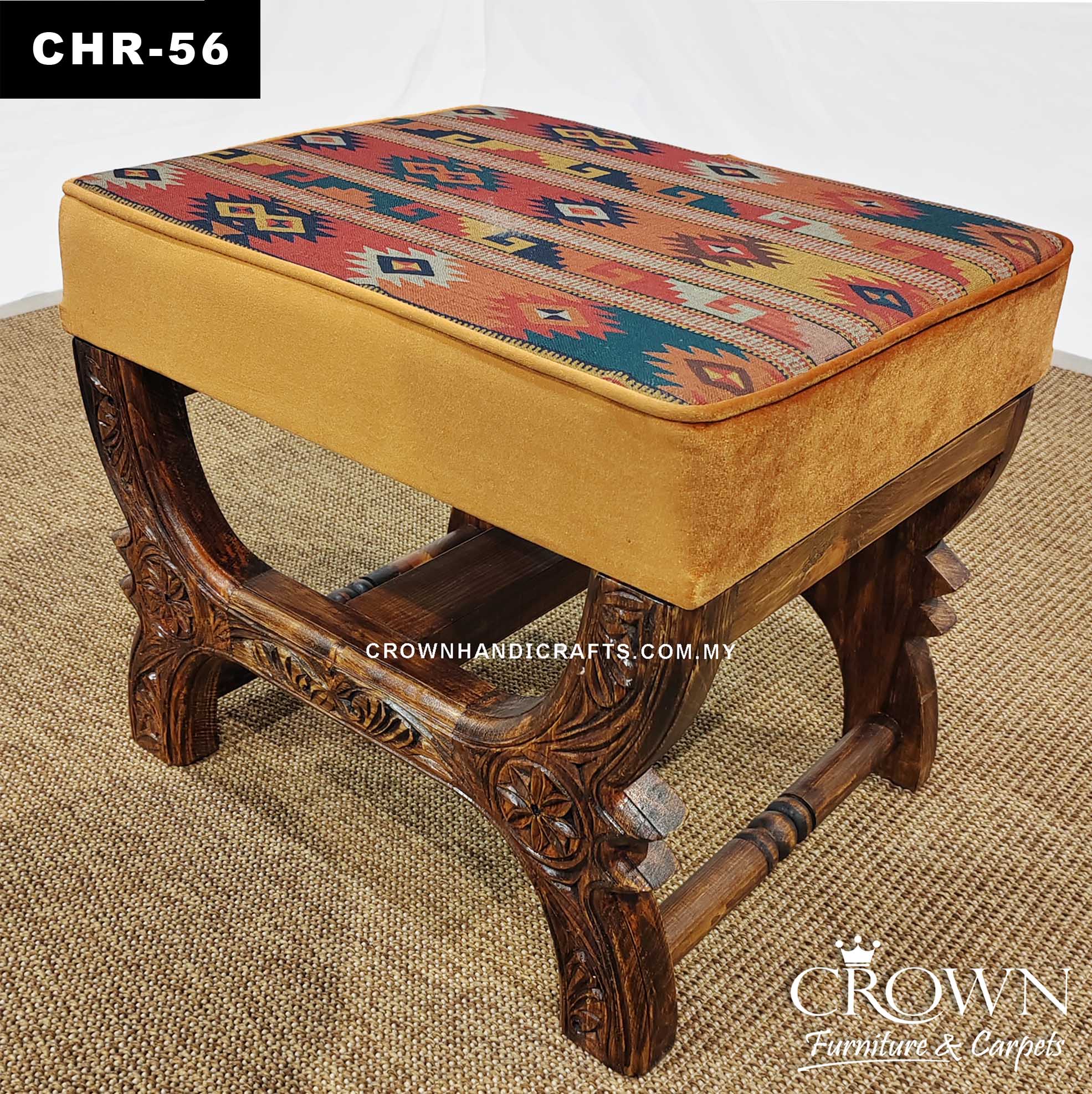 Handcrafted Ottoman Stool – Solid Wood with Intricate Carving and Kilim Style Soft Cushion | CHR-56 (L20 W16 H17 Inches)